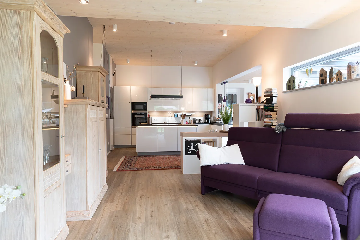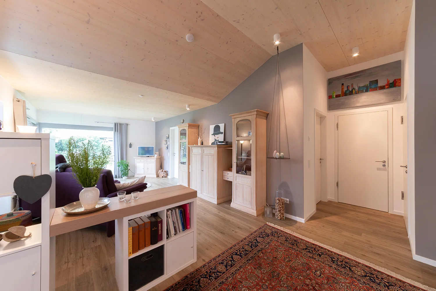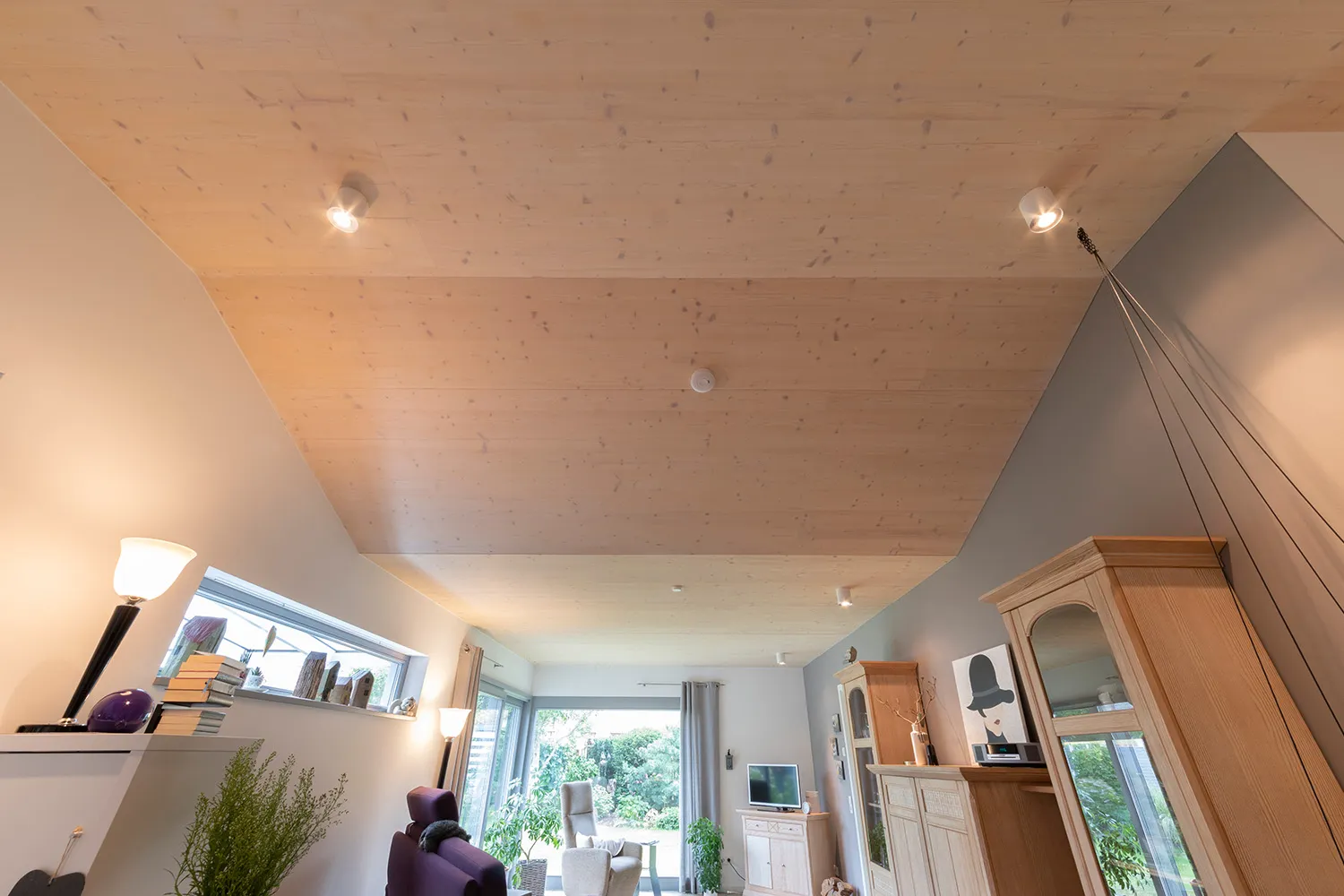 Massivholzdecke mit Versprung schafft offenes Raumgefühl