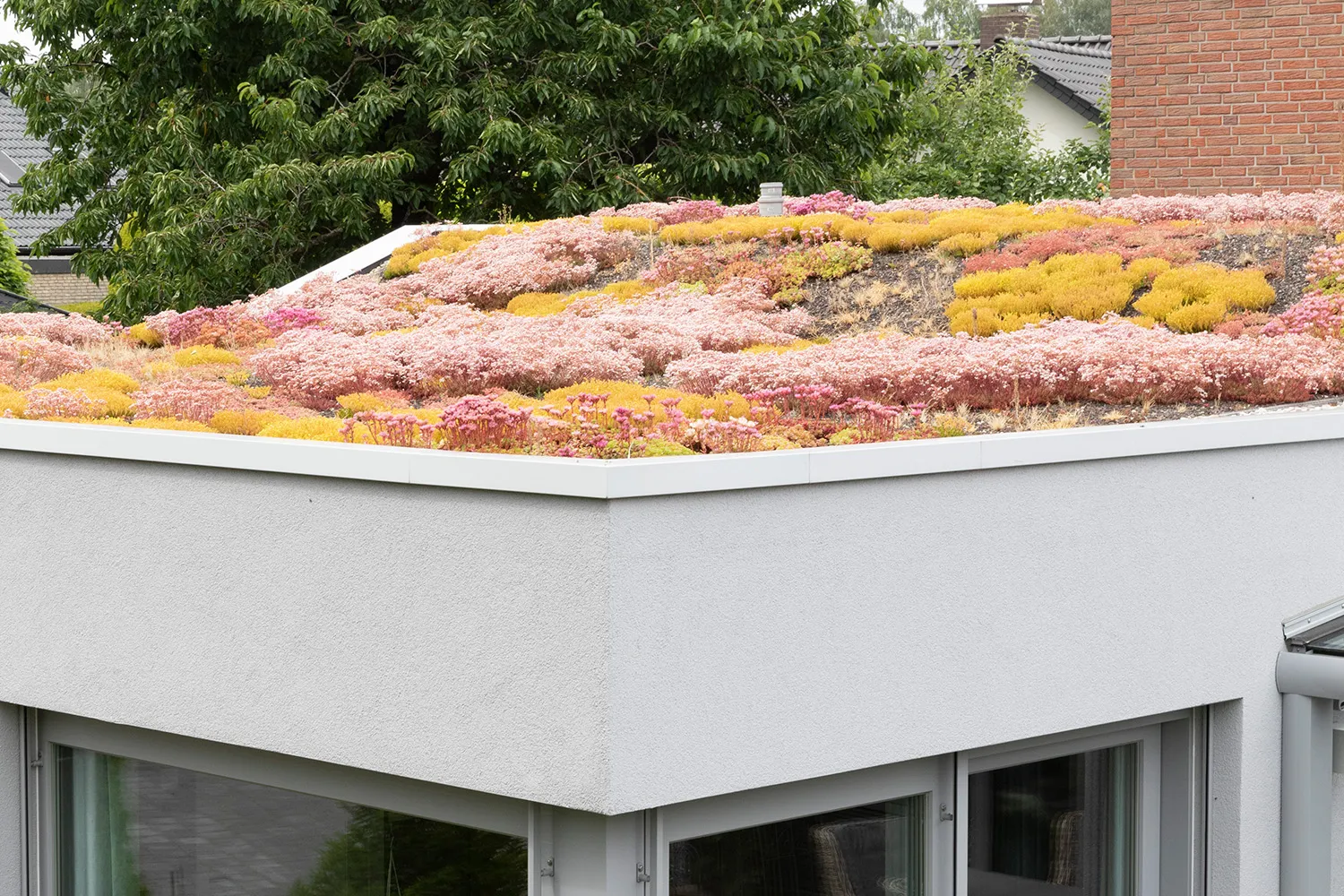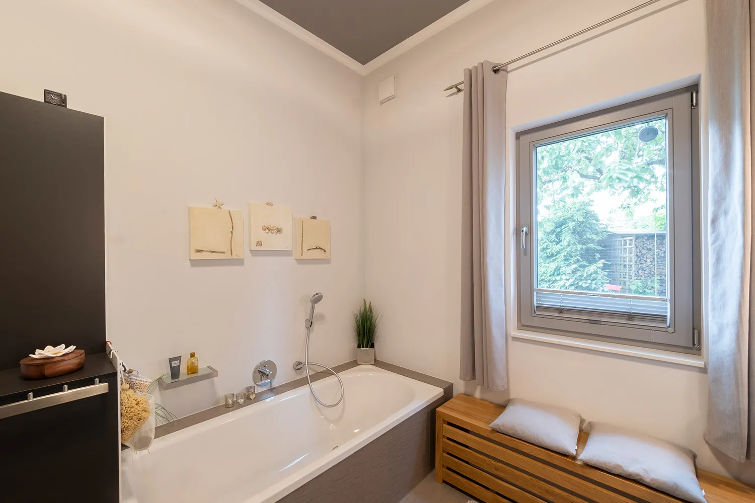 Im Innenbereich des Anbaus verleiht ein Höhenversprung in der Massivholzdecke den Räumen mehr Offenheit. Das weiß gestrichene Holz mit durchscheinender Maserung lässt die Wohnung hell und harmonisch wirken. Eine Dachbegrünung schützt im Sommer vor Hitze, während die Pflanzen im Winter die Wärmedämmung verbessern – ideal, um Heizkosten zu sparen.