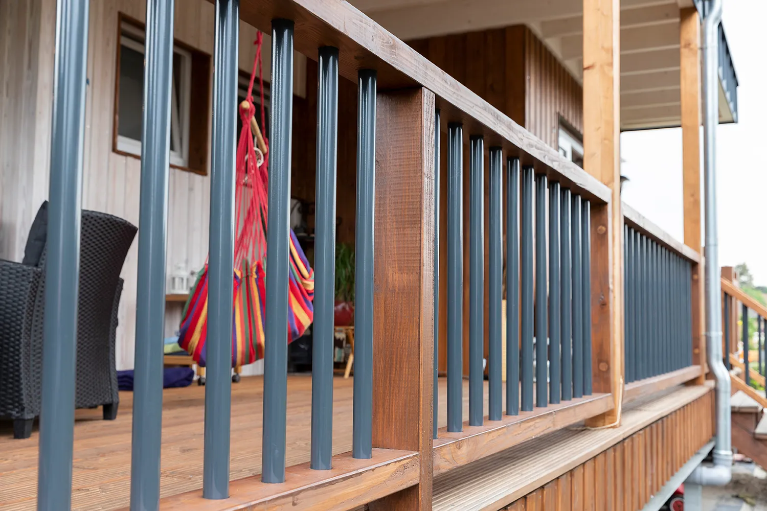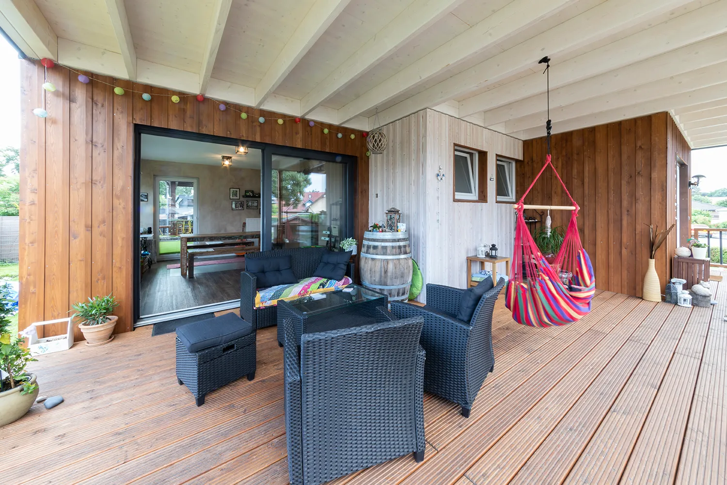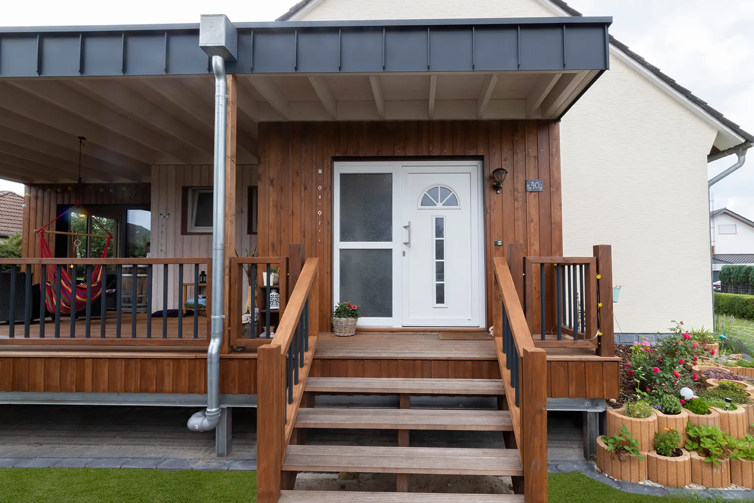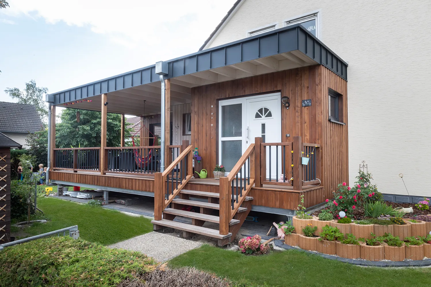Eine einladende Veranda aus besonders witterungsbeständiger Lärche ist der Blickfang dieses Anbaus im amerikanischen Stil. Die Fassade wurde mit einer Bodendeckel-Verschalung verkleidet, das Geländer aus Holz- und Aluminium sticht kunstvoll hervor. Bodentiefe Fenster im Wohnbereich des Anbaus geben den Blick ins Grüne frei.