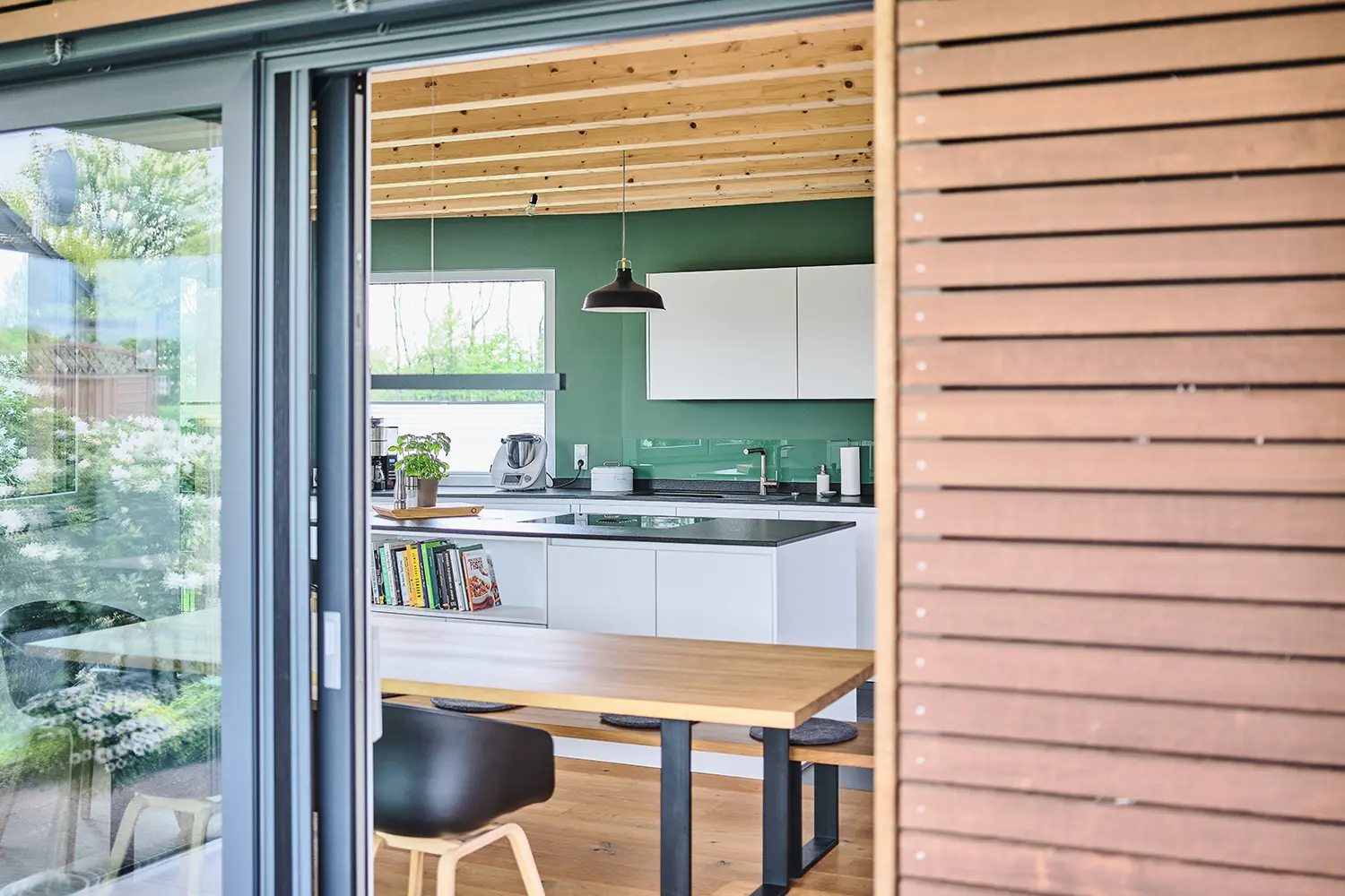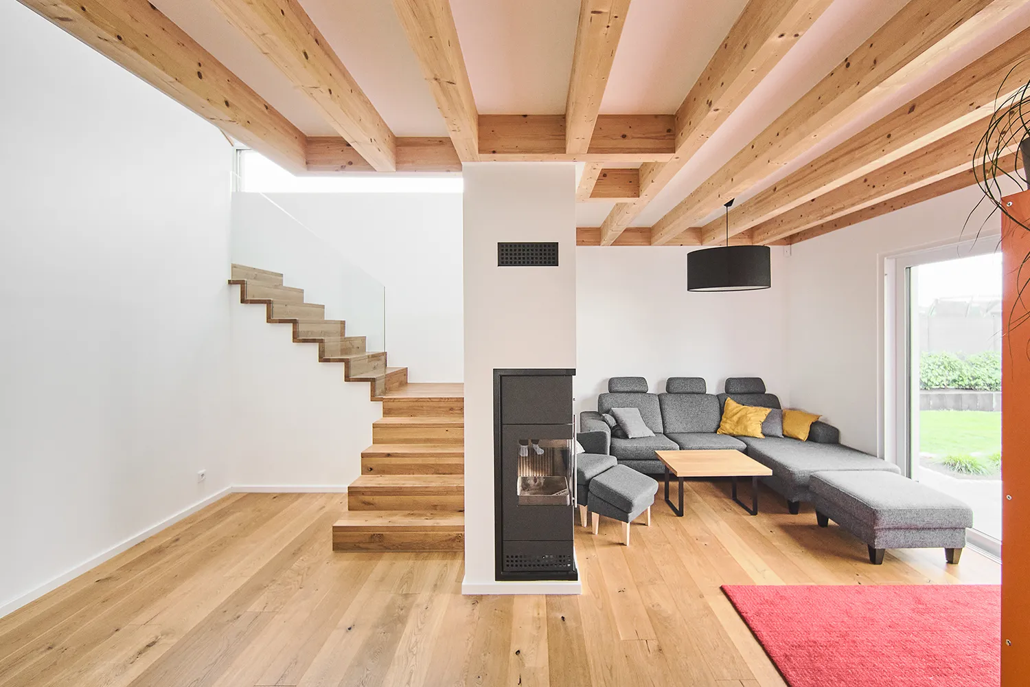 Das Innere des Hauses zeichnet sich durch eine einladende und helle Gestaltung aus. Ein sichtbarer Stahlträger und eine Kassettendecke betonen die offene Raumgestaltung im Erdgeschoss. Die offenen Balken vermitteln das für Holz typische, angenehme Wohnklima und ein Gefühl von traditionellem Handwerk. Die Küche ist individuell entworfen und bietet einen inspirierenden Raum für kulinarische Kreationen.