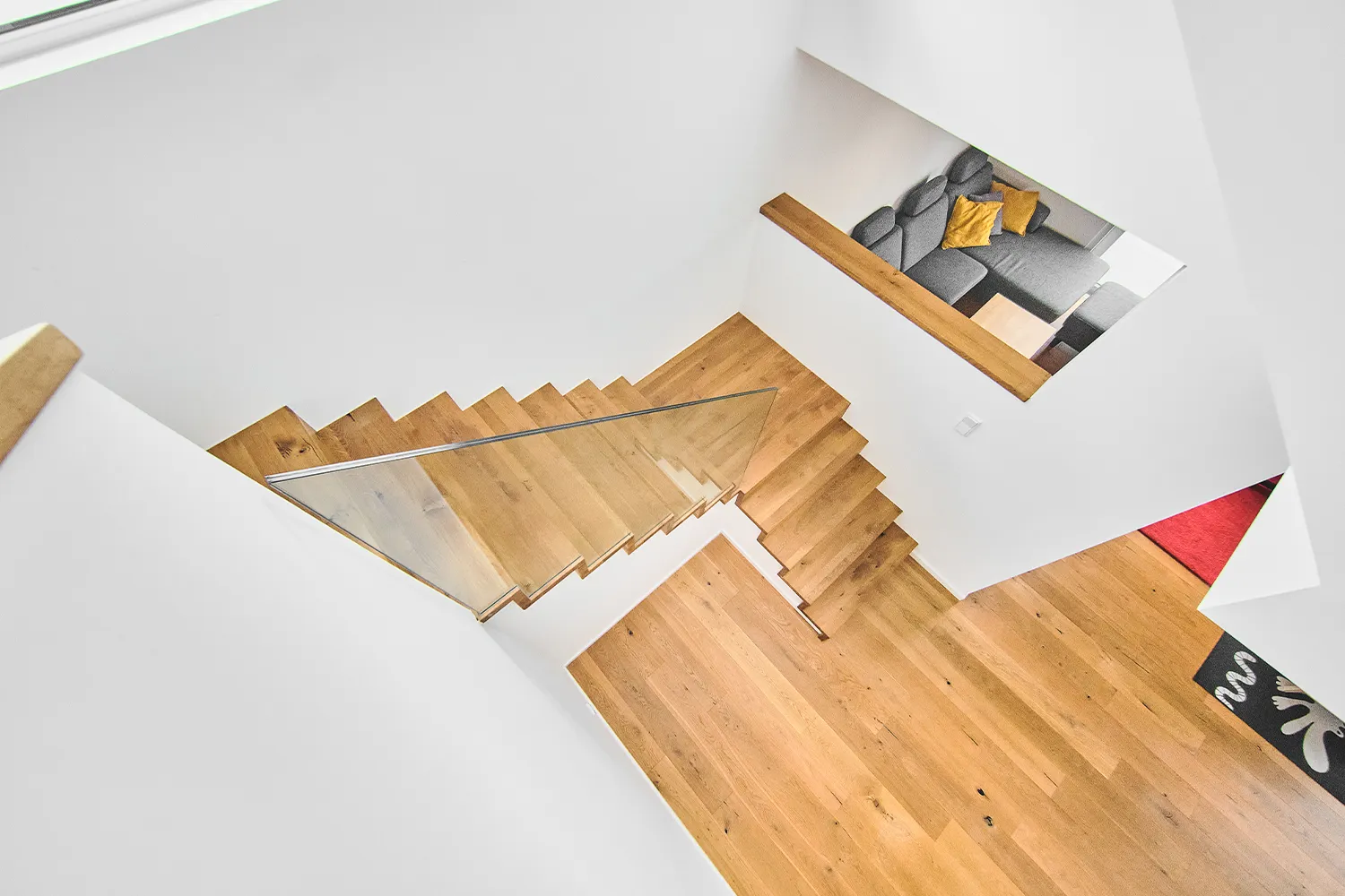 • Treppenhaus mit elegantem Glasgeländer und individuell gefertigtem Holzhandlauf