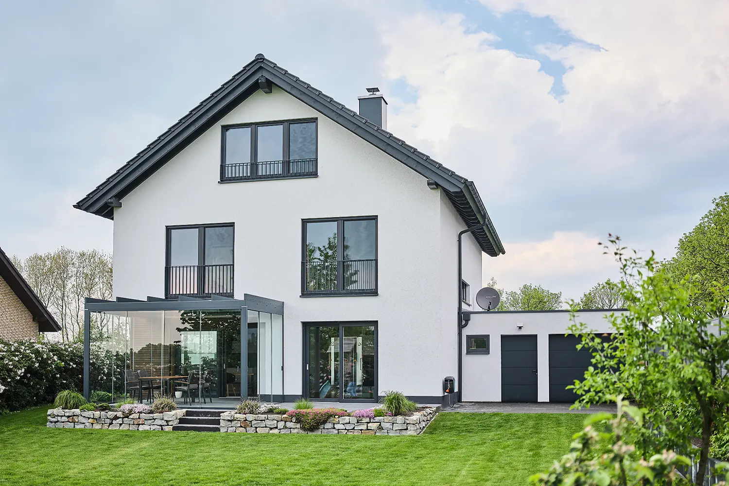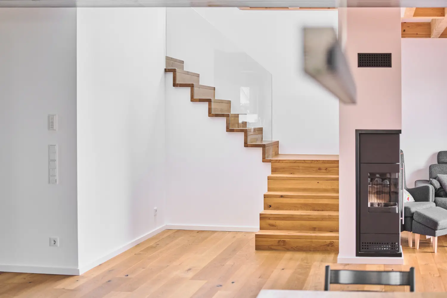 Ein besonderes Augenmerk lag auf dem Treppenhaus. Es verfügt über Eichenholzstufen, ein Glasgeländer und einen individuell gefertigten Handlauf. So kombiniert das Treppenhaus Eleganz mit Funktionalität. Der Kamin im Wohnzimmer fungiert gleichzeitig als Raumteiler. Im Wintergarten mit rahmenloser Verglasung kann man die Natur das ganze Jahr über hautnah erleben.