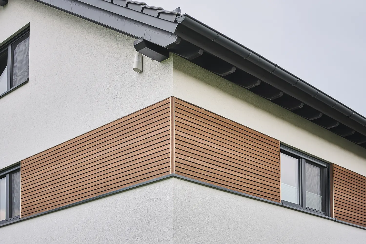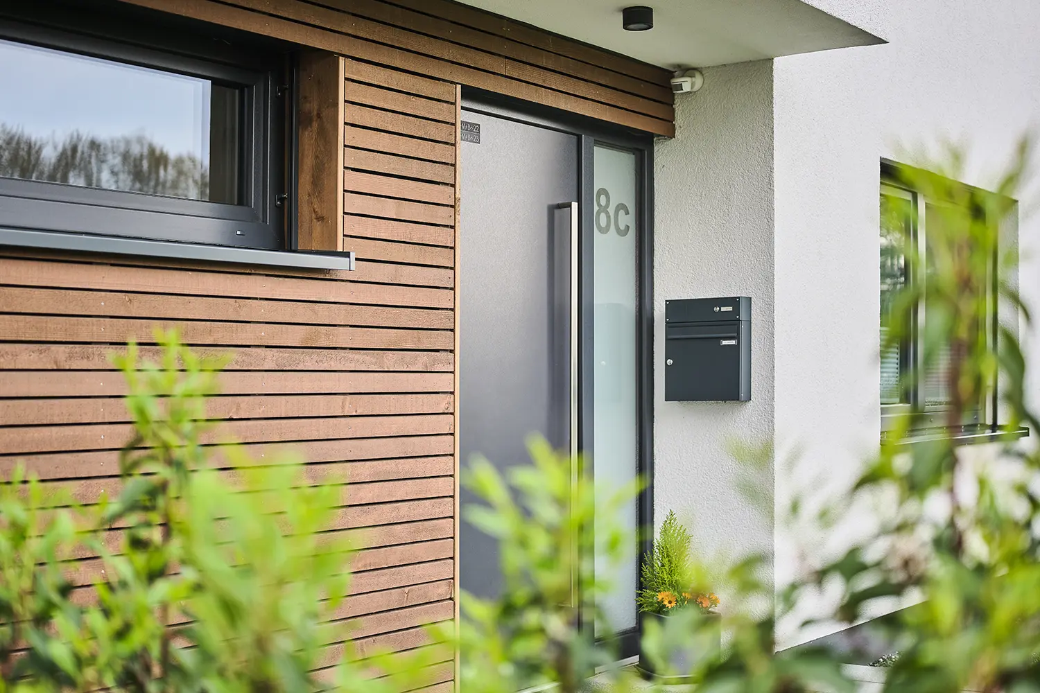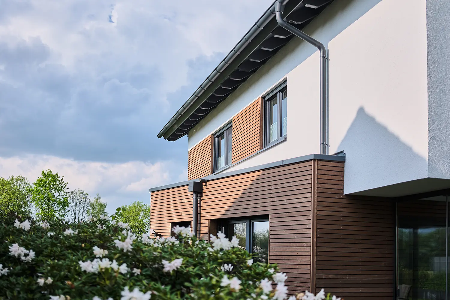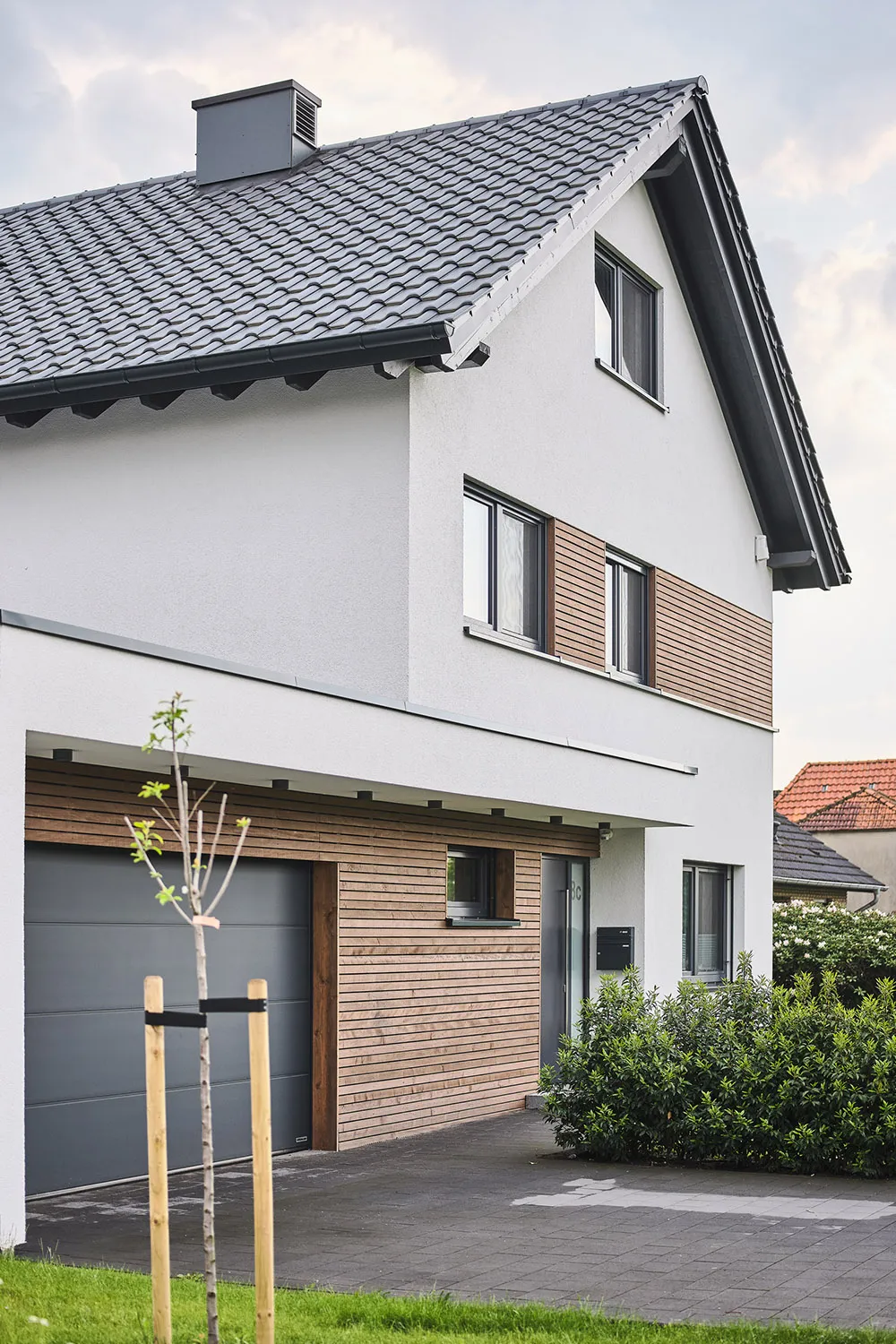 Die Holzelemente der Holzputzfassade sind präzise in die Fassade eingelassen. Der Dachüberstand ist minimalistisch gestaltet und passt farblich zur Holzverkleidung darunter. Die Doppelgarage ist ebenfalls mit Holz verkleidet und hat einen direkten Zugang zum Garten.