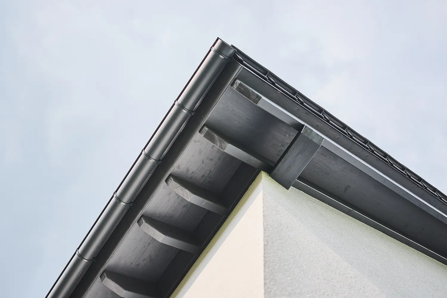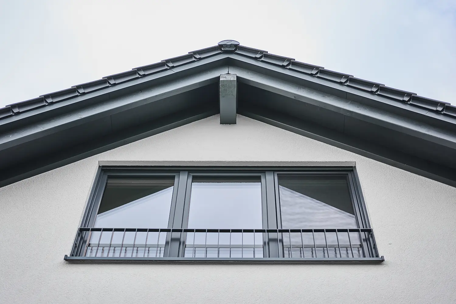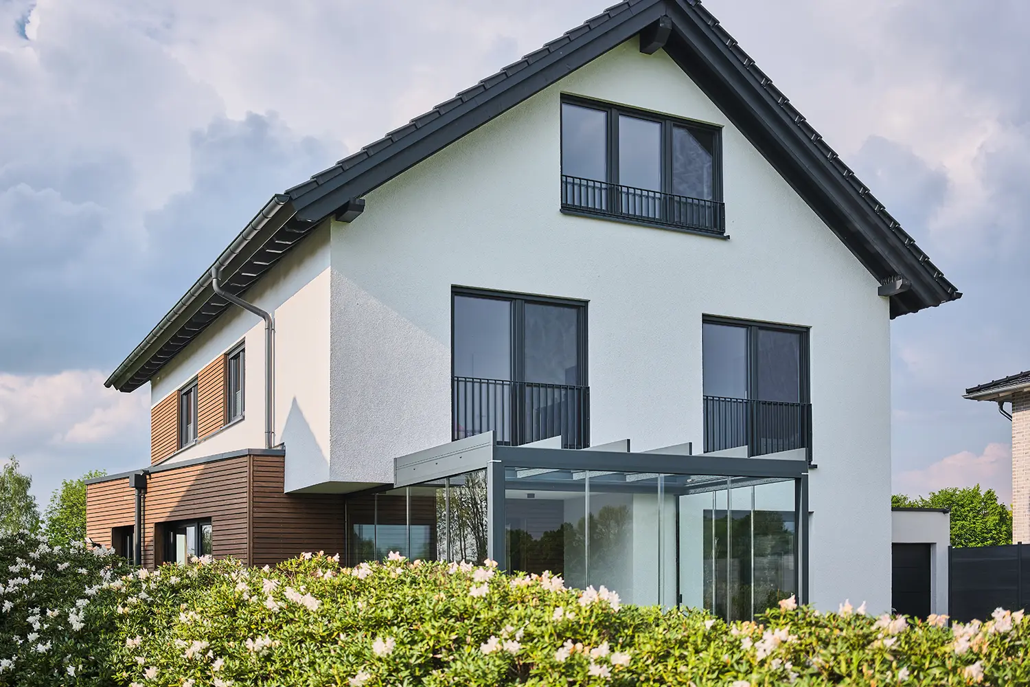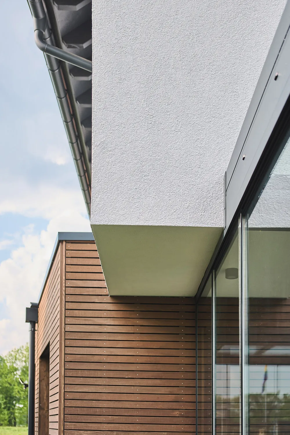 Charakteristische Holzputzfassade und minimalistischer Dachüberstand