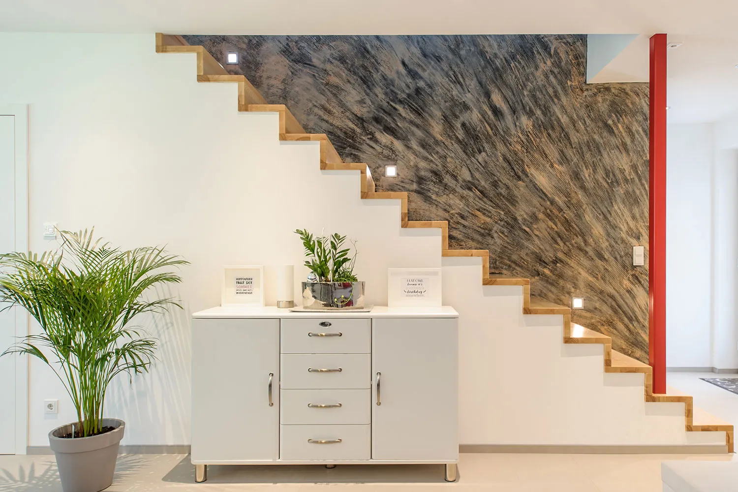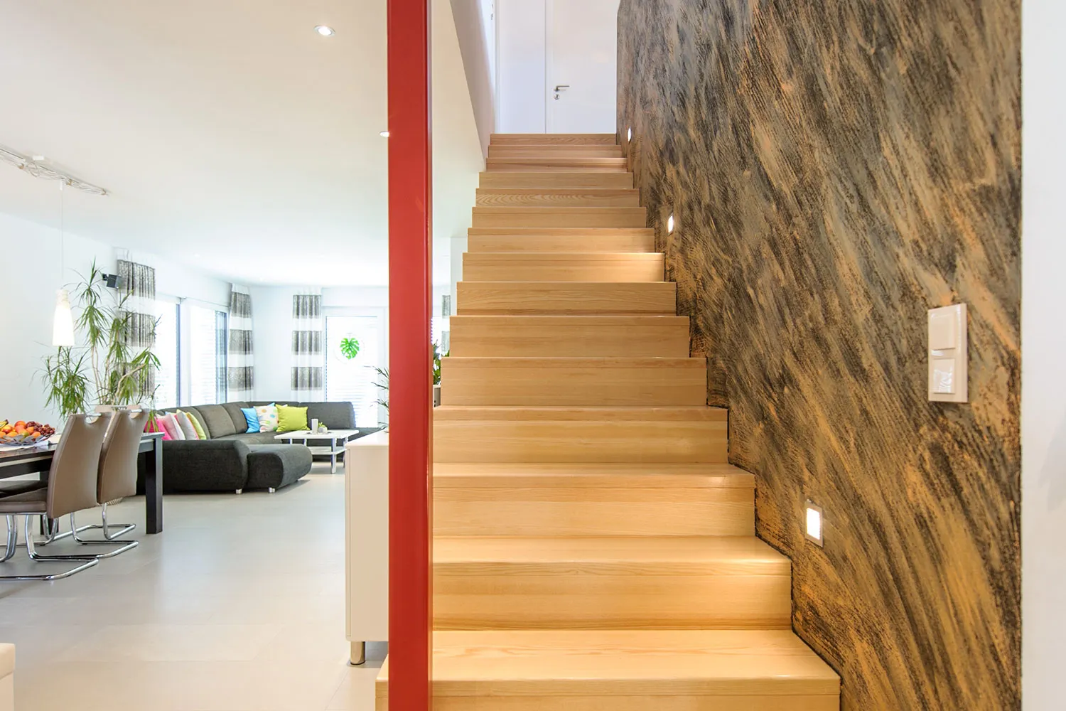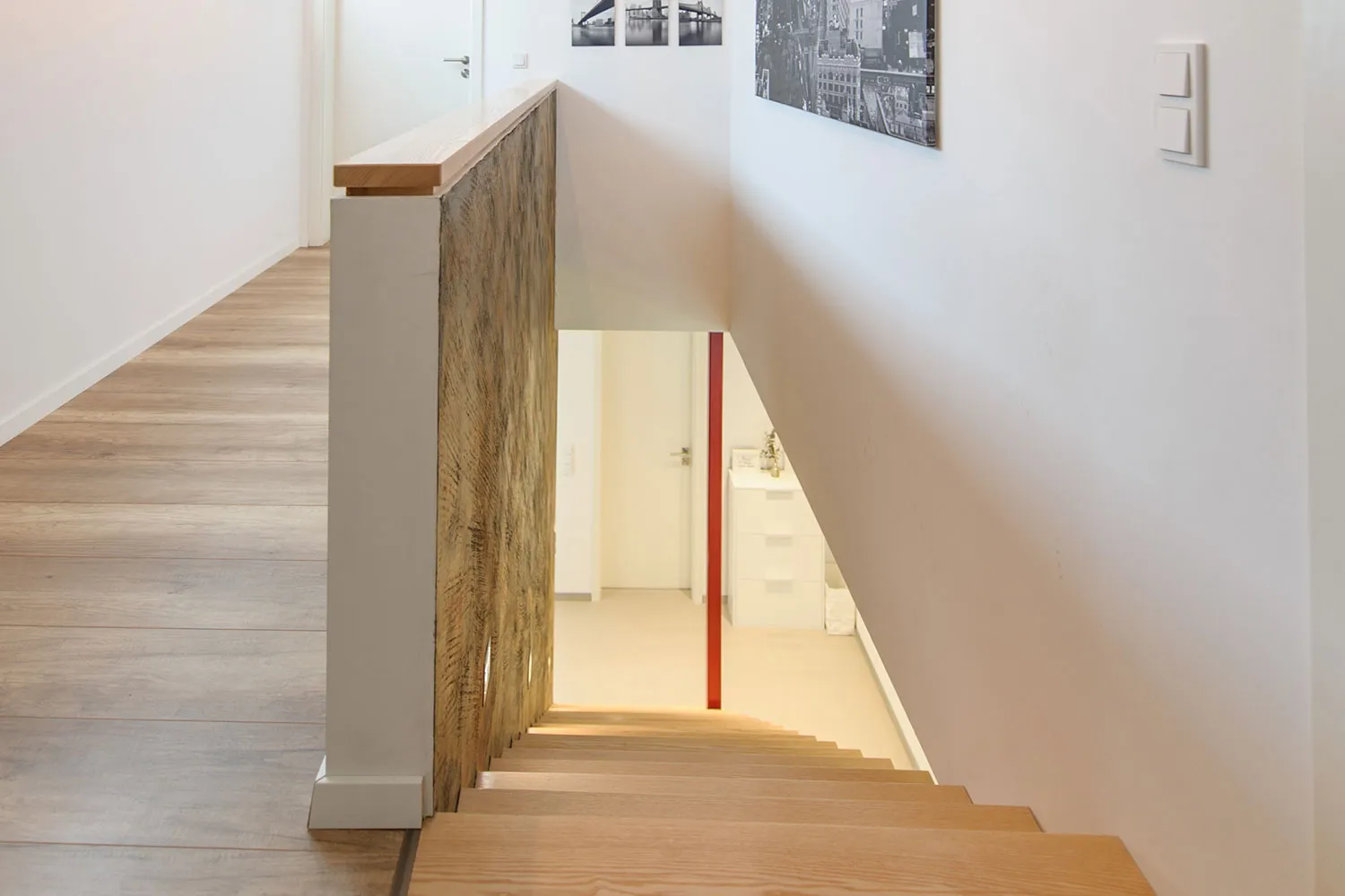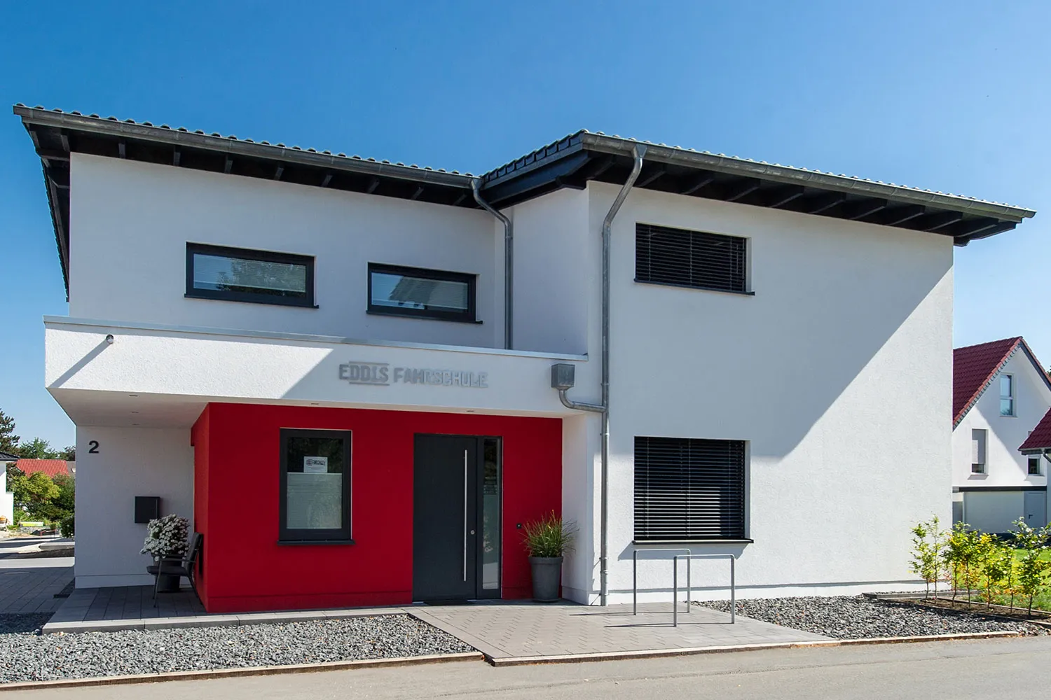 Dieses Holzrahmenhaus kombiniert privaten Wohnraum mit Gewerbefläche: Für die Fahrschule wird die Einliegerwohnung mit separatem Eingang und Schallentkoppelung der Wände genutzt. Besonderheiten sind die Wände im Obergeschoss, die bis zum Fist offen sind, sowie das Vordach, das elegant in die Hausarchitektur integriert ist. Da das Haus keinen Keller hat, sind die Luftwärmepumpe und die gesamte Haustechnik im OG platziert – so kann das EG vollständig als Wohn- und Gewerbefläche genutzt werden.