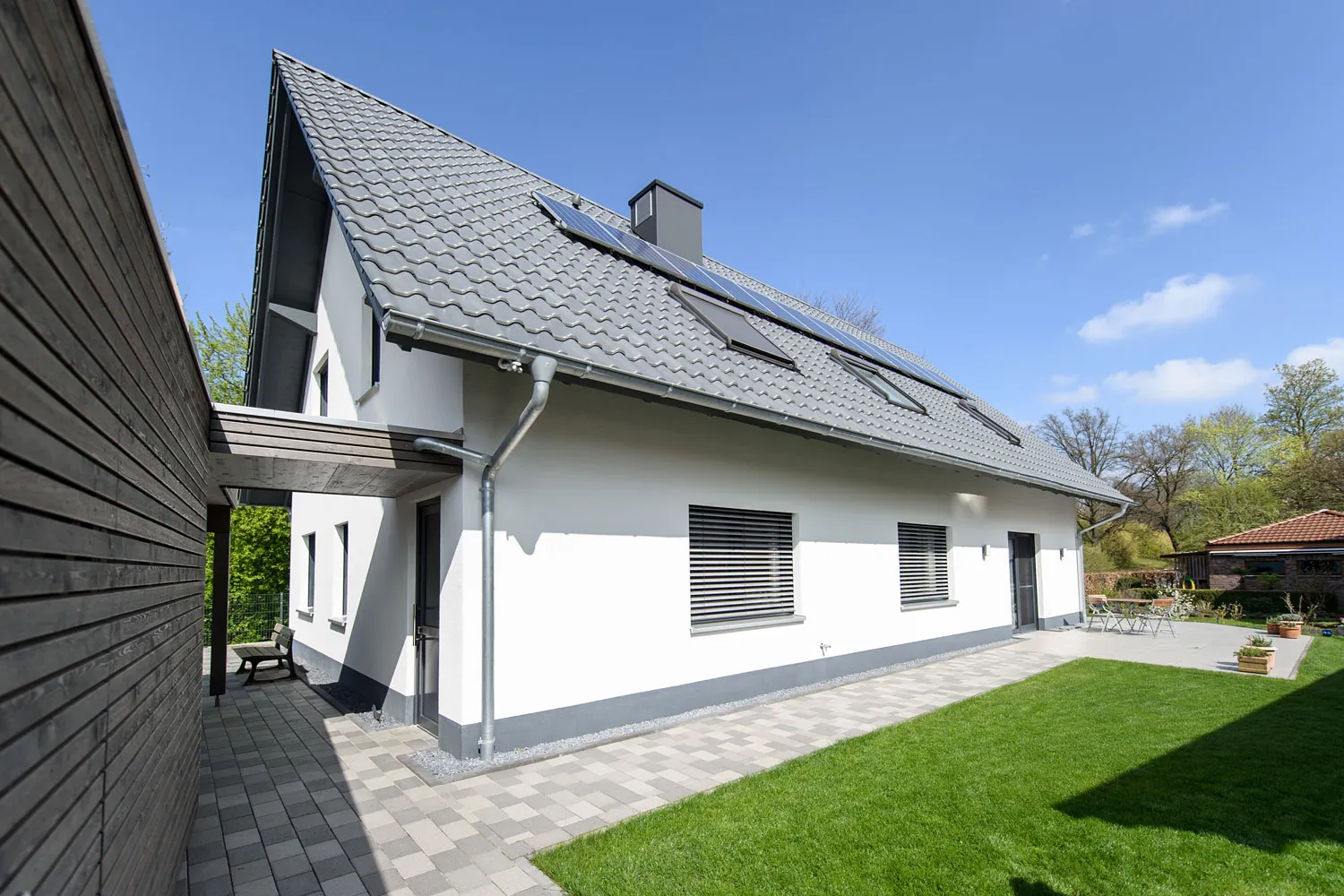In diesem Holzrahmenhaus ist eine Massivholzdecke verbaut, die auch in den Carport weitergeführt wurde. Man erreicht das Haus vom Carport immer trockenen Fußes. Dank einer Wärmepumpe im Obergeschoss und Luftkanälen über dem Dach sind keinerlei Gitter in der Fassade nötig – das sorgt für ein optisch klares Außenbild der Fassade. Die Zellulosedämmung sowie die Schiebetüren mit einer eigenentwickelten Dichtung sorgen für die nötige Dämmung und den Schallschutz. Die Raffstoranlage ist geschickt hinter der Putzfassade versteckt. Das Haus erfüllt den KfW-40-Standard und ist dadurch gut förderfähig.