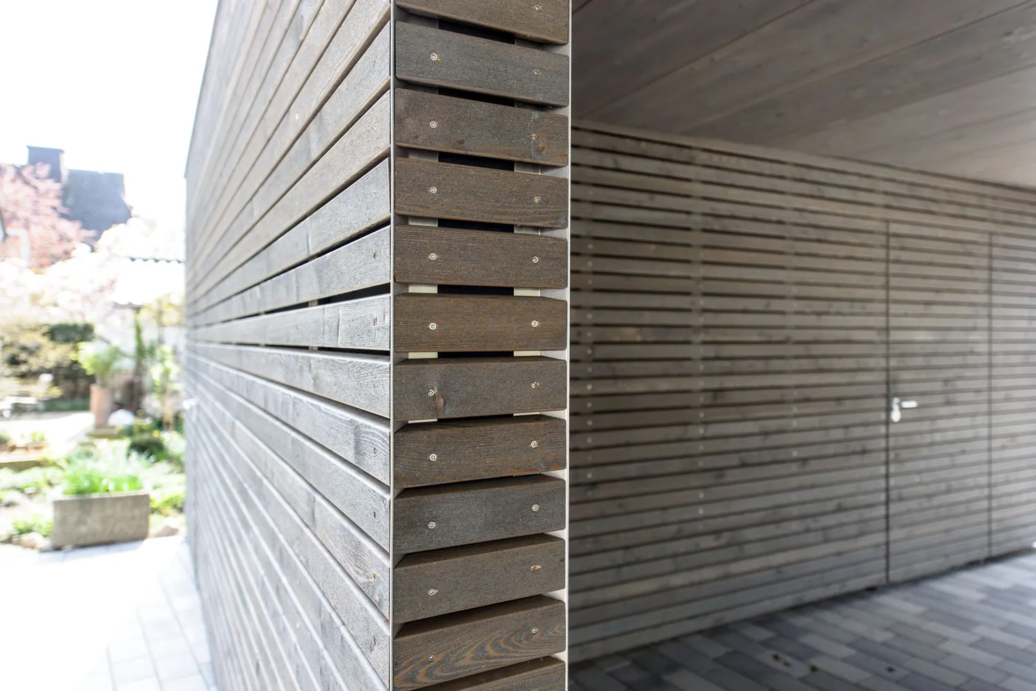 Elegante Weiterführung der Massivholzdecke in den Carport