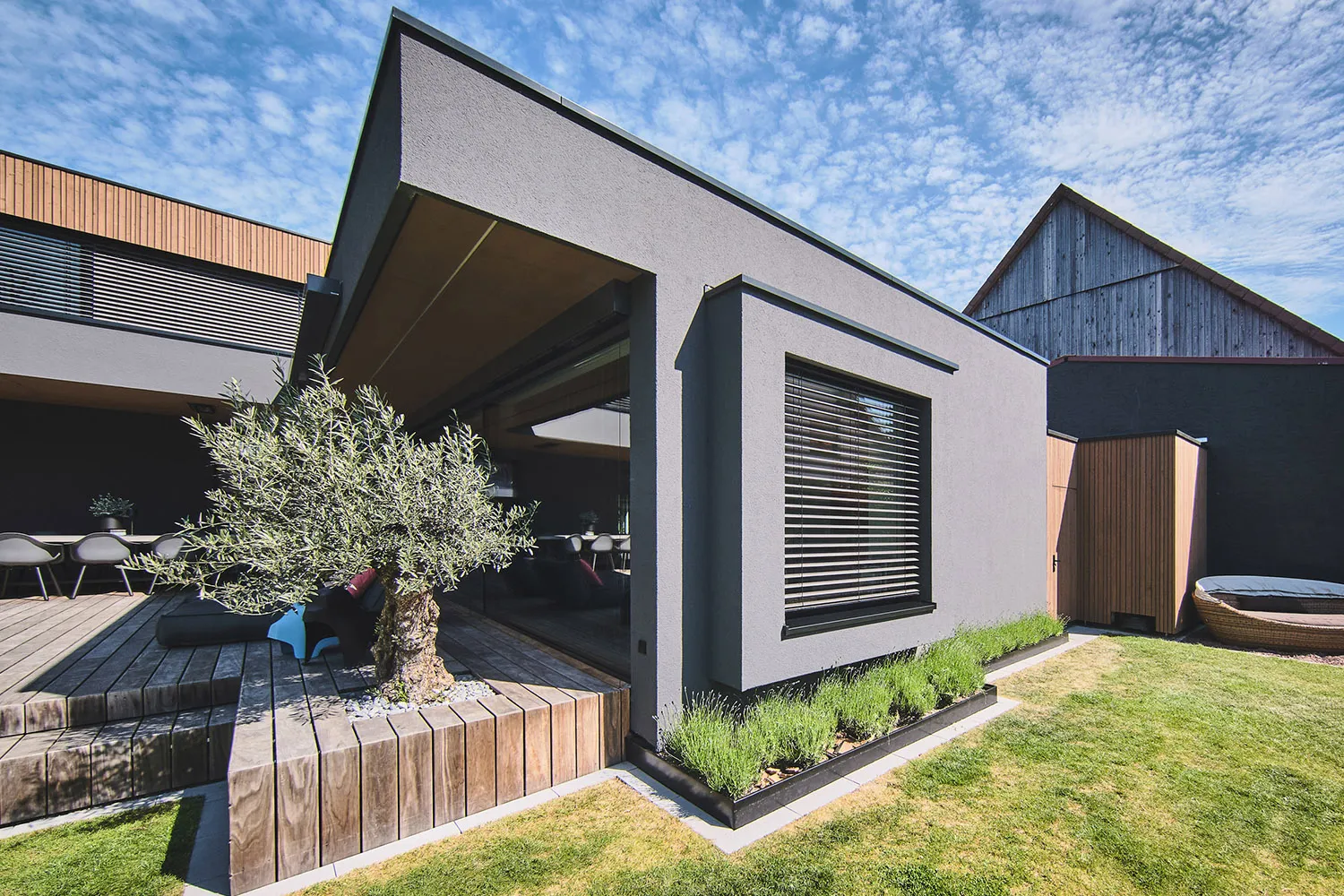 Die Holzterrasse verfügt über eine großzügige Fläche und eine nahtlose Decke, in die flächenbündig Heizstrahler eingelassen wurden. Der Boden besteht aus langlebigem Kebony-Holz. Diese nachhaltige Alternative zum Tropenholz verleiht der Terrasse eine elegante und hochwertige Optik. Rahmenlose Panoramafenster ermöglichen den Ausblick in den Garten. Für den Vorgarten wurde ein individuell gestaltetes Sitzmöbel entworfen und hergestellt. Dieses raumtrennende Möbelstück bietet einen bequemen Ort zum Entspannen mit viel Sichtschutz.