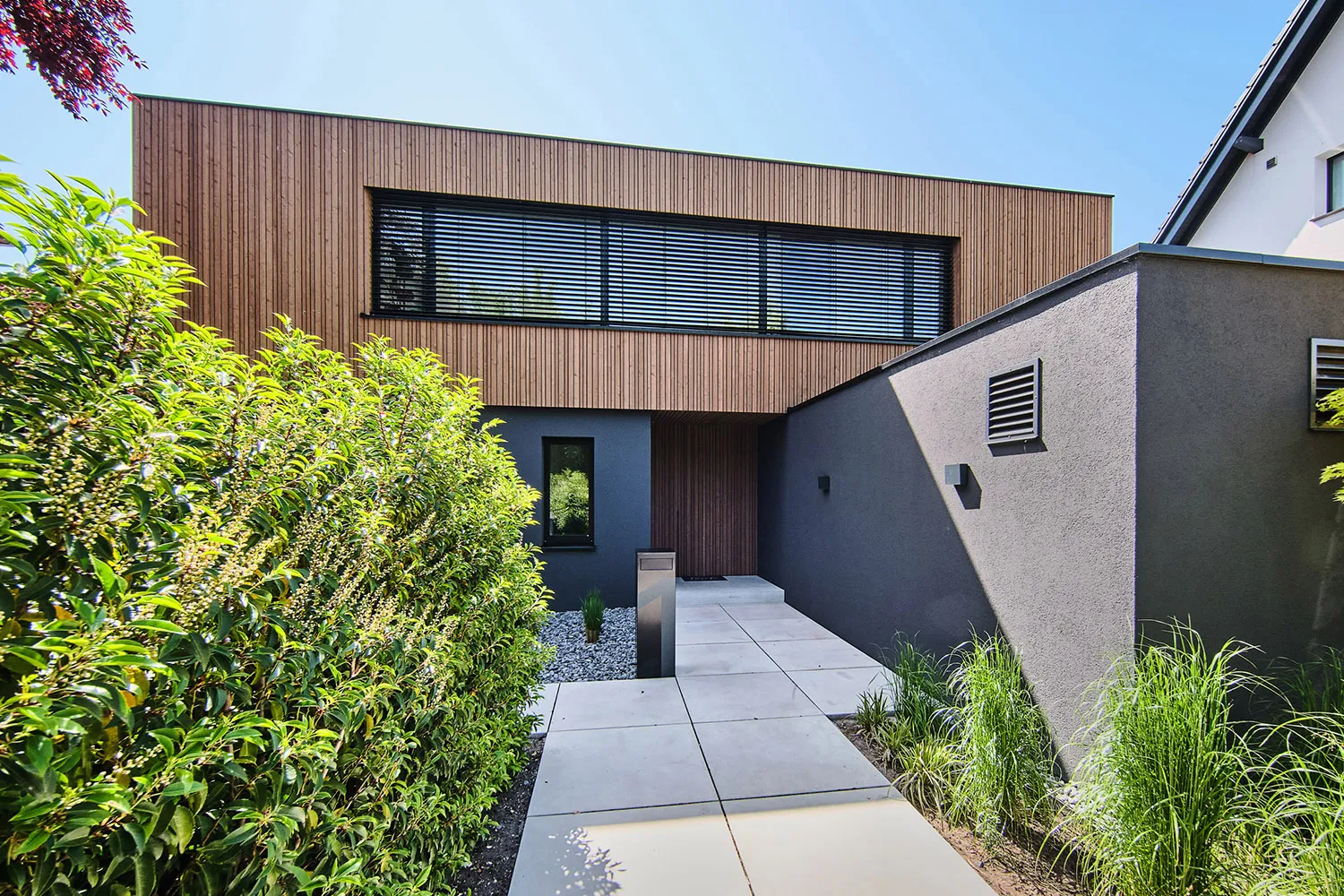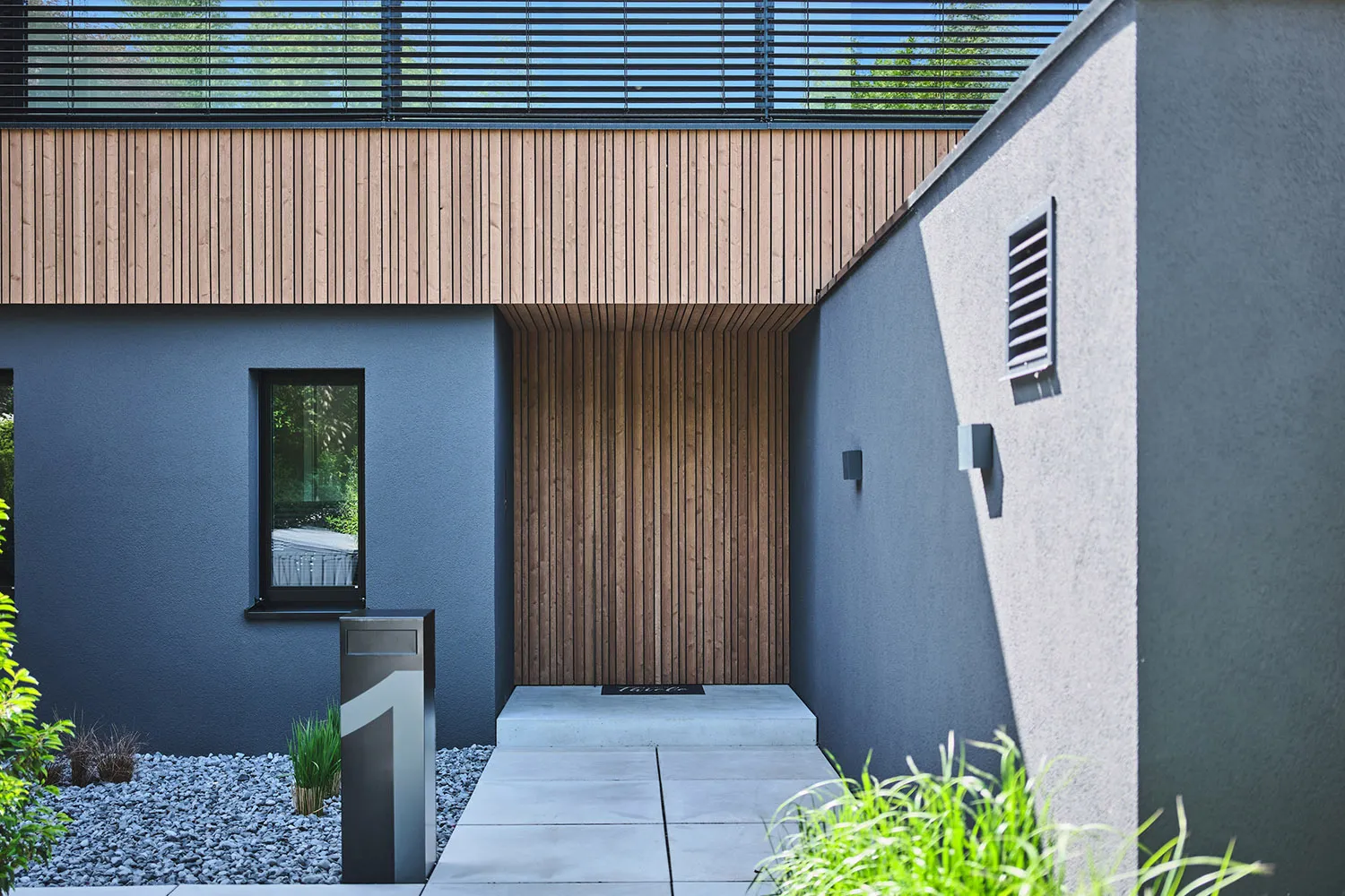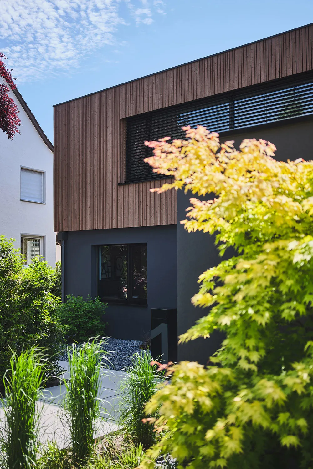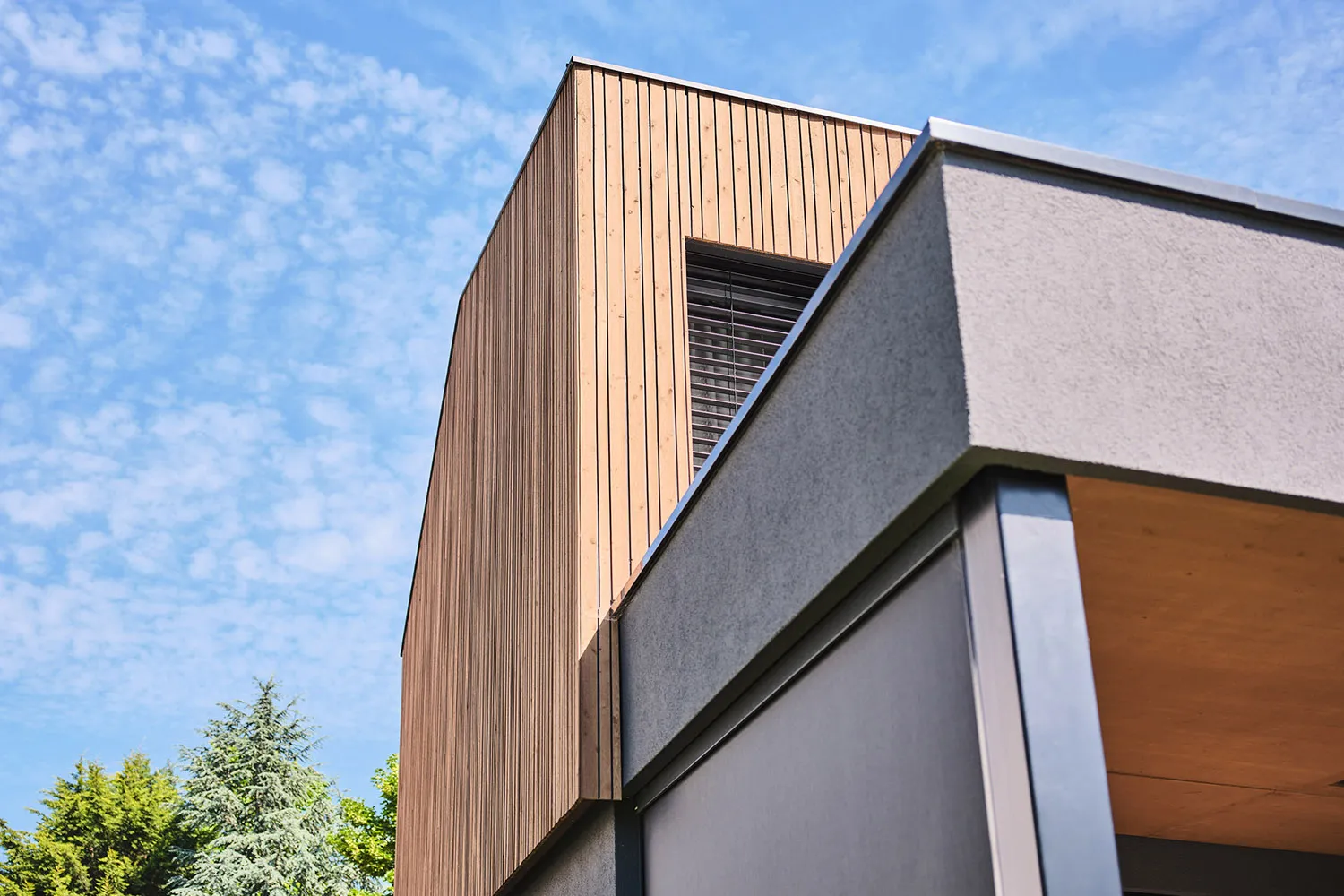 Die Fassade des Neubaus ist in einer Holzputzoptik gestaltet, die dem Einfamilienhaus eine natürliche und warme Optik verleiht. Um die minimalistische Ästhetik zu betonen, wurden markante Details wie ein durchgehendes, exaktes Fugenraster von der Fassade bis zur Terrasse, der Verzicht auf Dachüberstände sowie eine Haustür ohne sichtbaren Griff verwendet. Die Dachbegrünungen und die flächenbündig in das Holzsatteldach integrierte Photovoltaikanlage sind sowohl ästhetisch als auch ökologisch wertvoll. Ökologische Energieversorgung wird hier mit den natürlich isolierenden Eigenschaften des Baustoffes Holz vereint. Das Haus zeigt eindrucksvoll, dass intelligente und nachhaltige Energienutzung im Einklang mit kühner Architektur stehen kann. Der schwebende Carport mit direktem Zugang zur Fahrradgarage komplettiert das Gesamtkonzept.