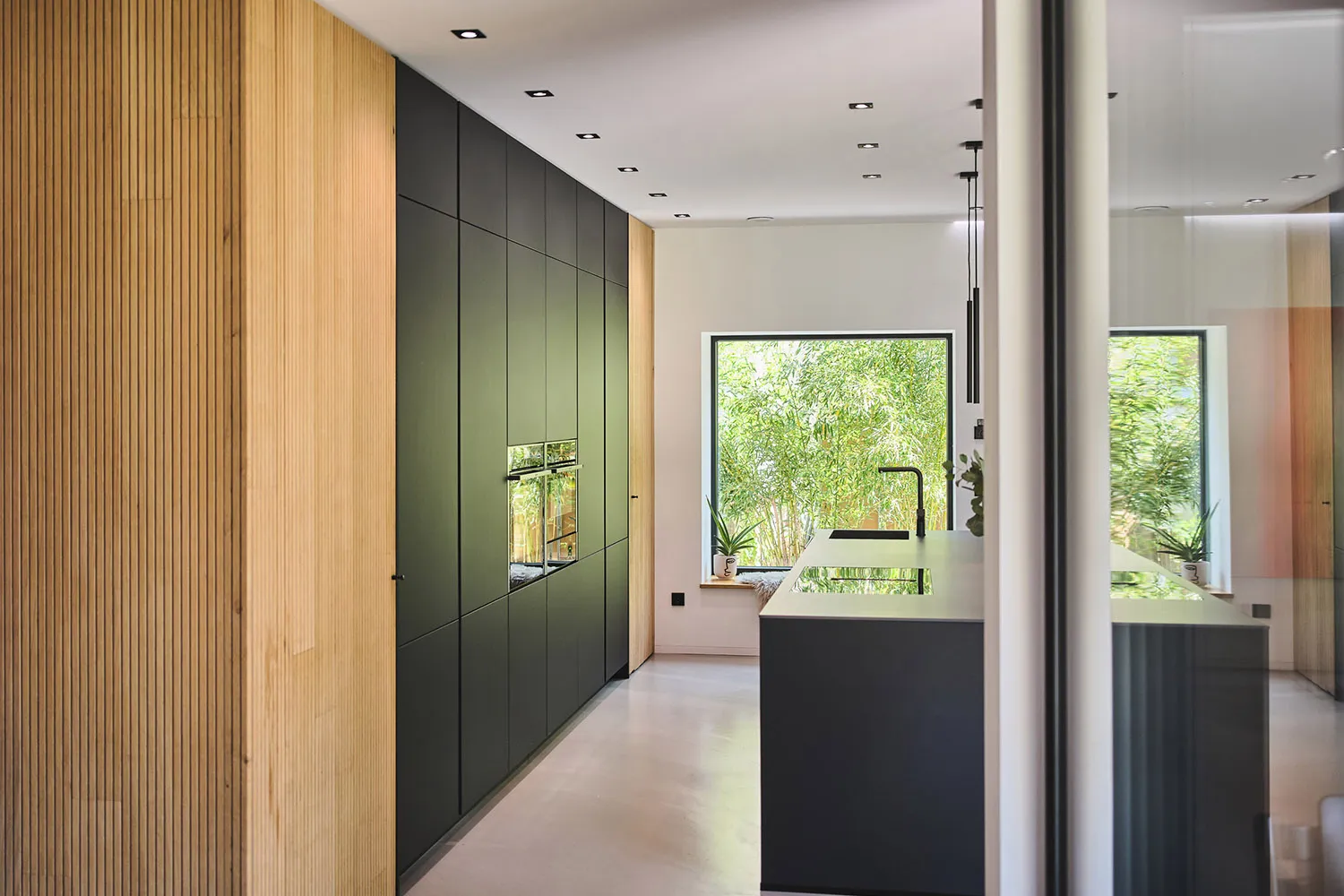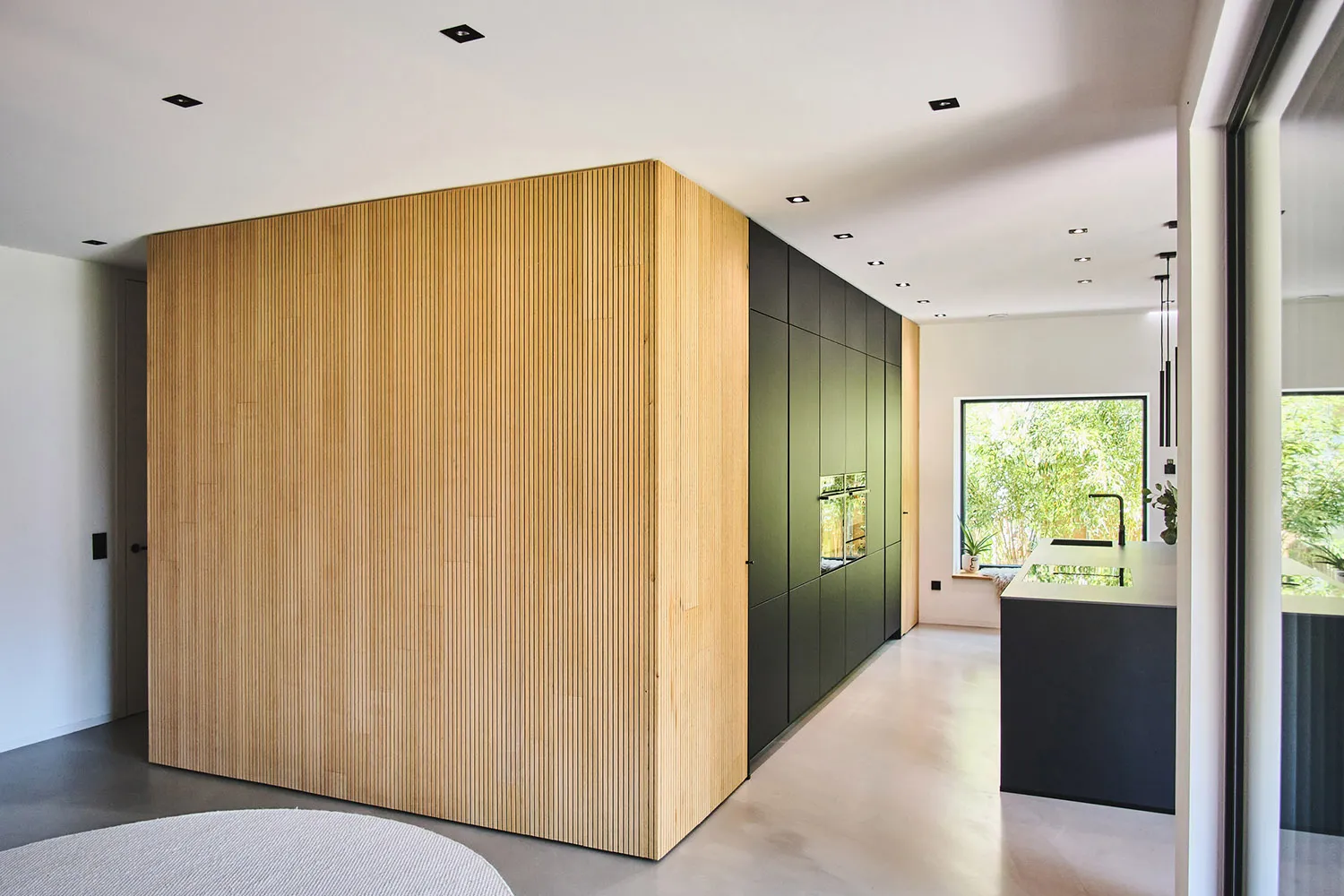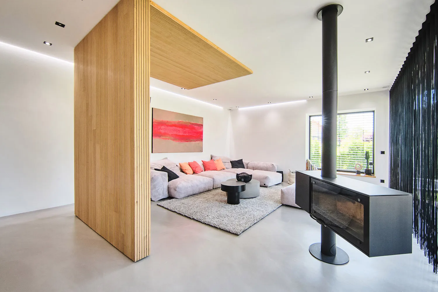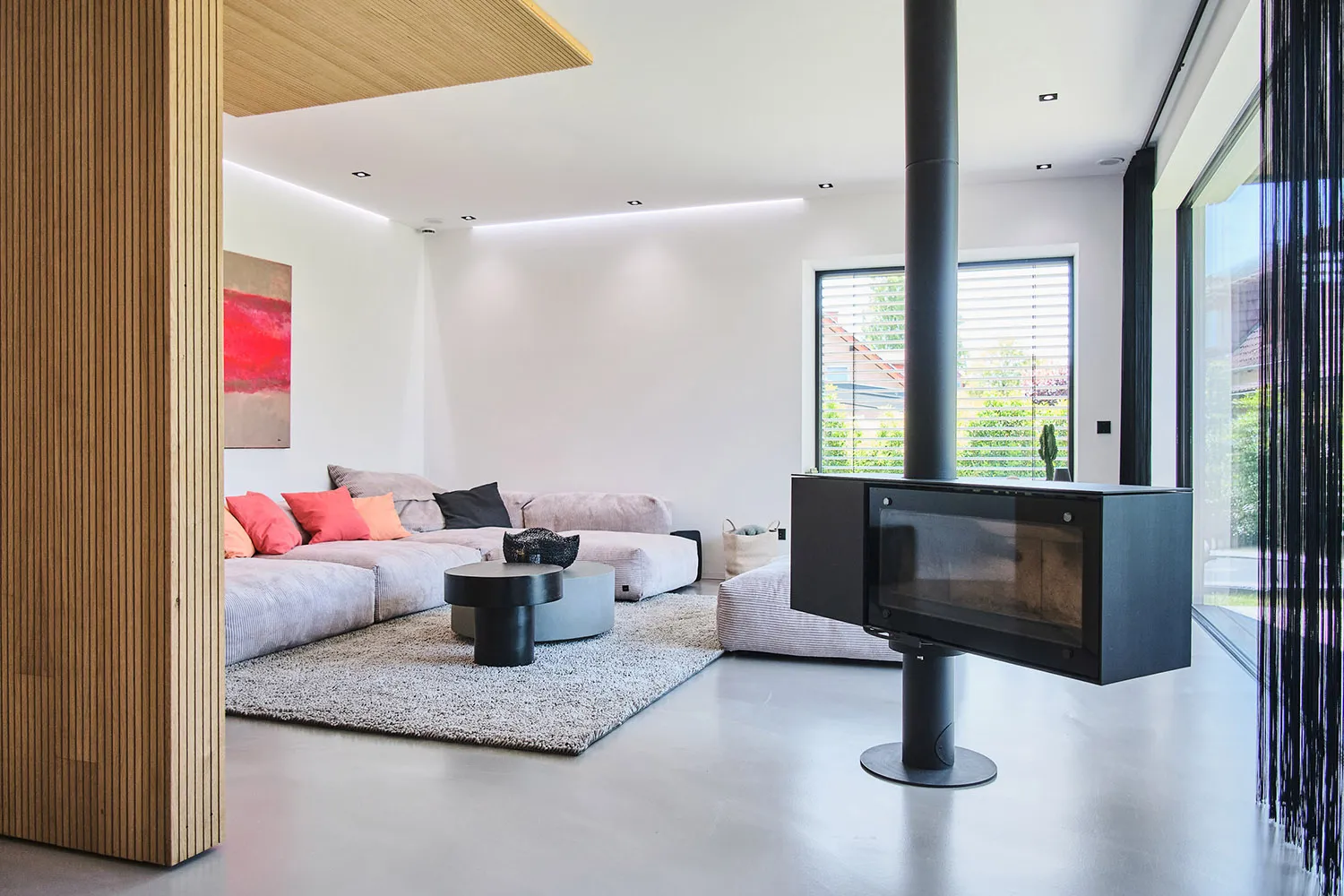 Das Haus verfügt über überdimensionale Fenster, die für Tageslicht in allen Räumen sorgen. Das Innere des Hauses zeichnet sich durch offene Elemente aus. Ein Raumtrenner aus Holz verleiht dem Wohnzimmer eine besondere Struktur. Die Küche ist puristisch gestaltet und in mattem Schwarz gehalten. Die klare Formgebung und hochwertigen Materialien der Küche vermitteln eine zeitlos elegante Optik.