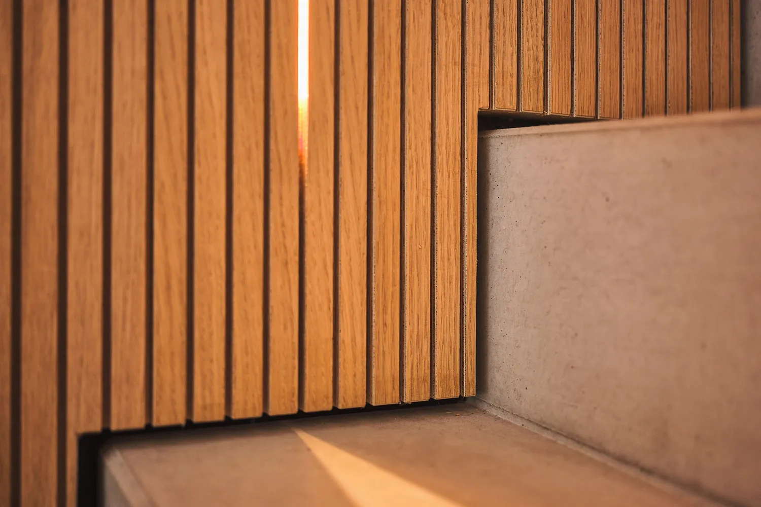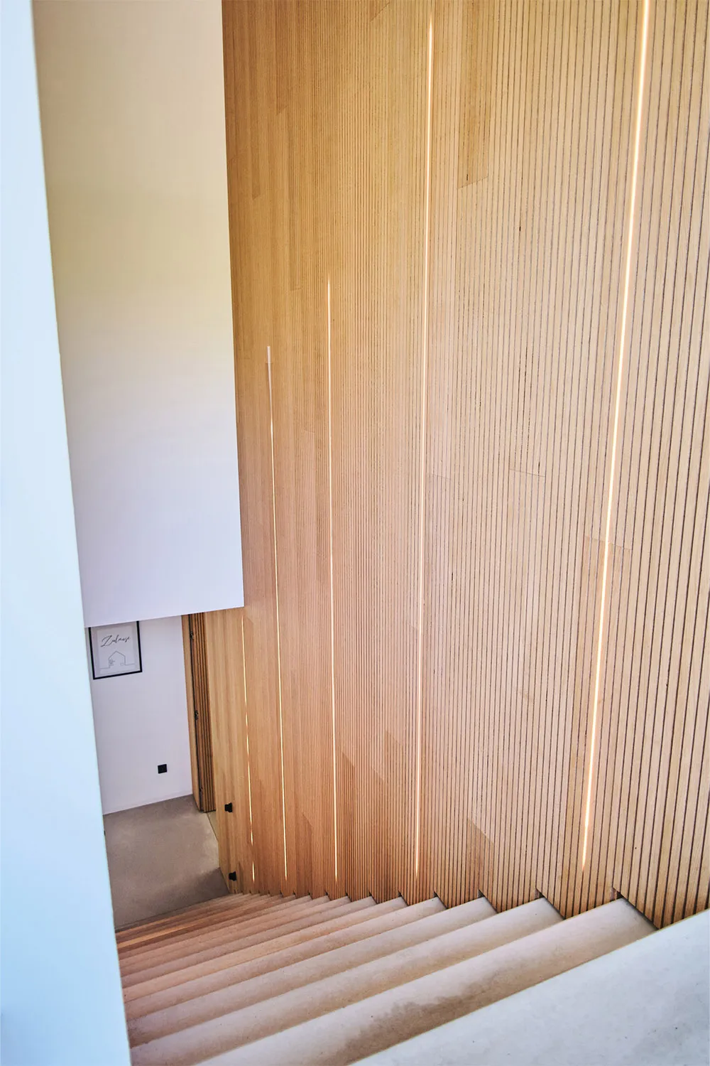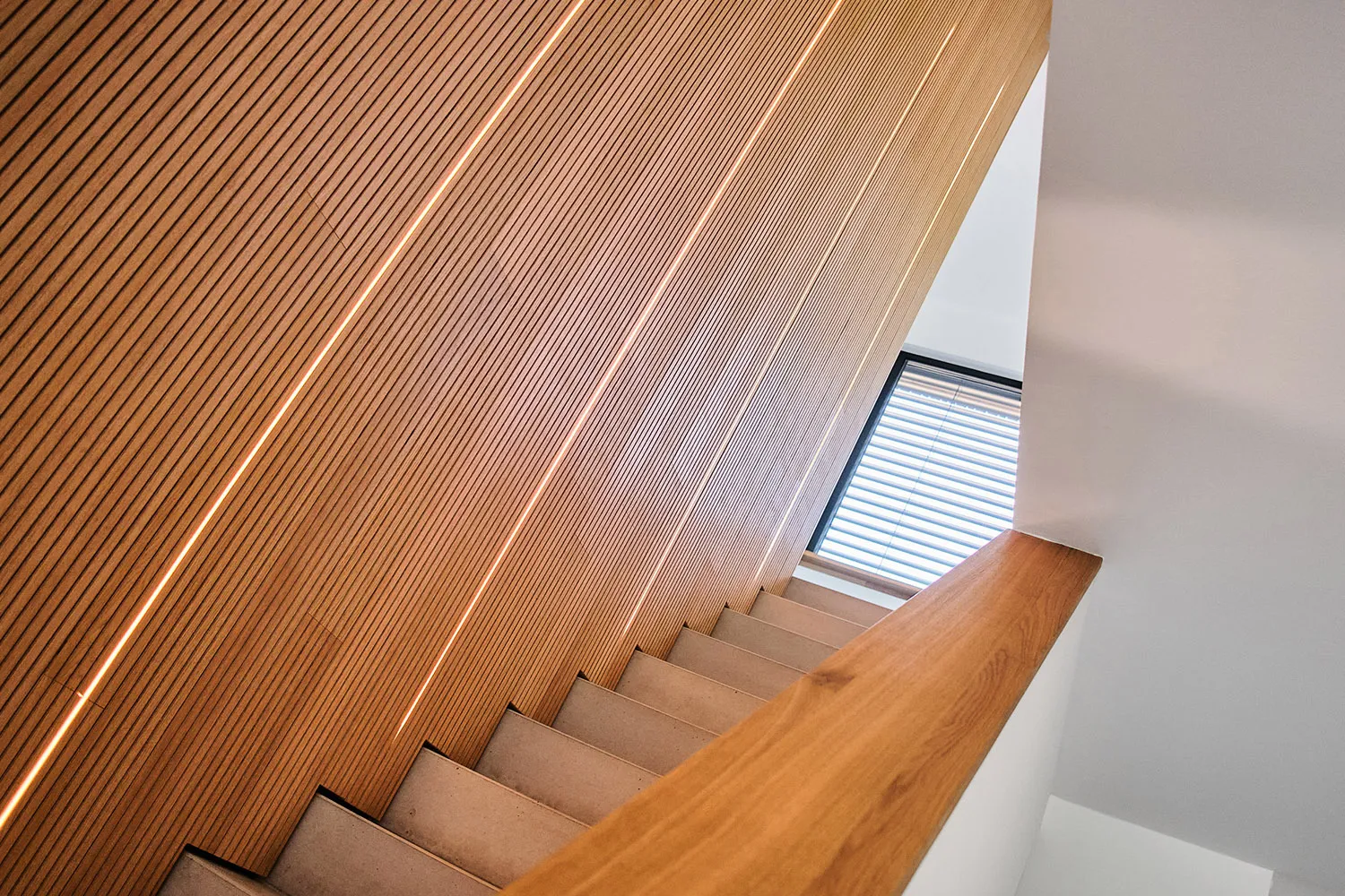 • Elegante Waschbetontreppe mit vollflächiger Holzverkleidung und LED-Beleuchtung