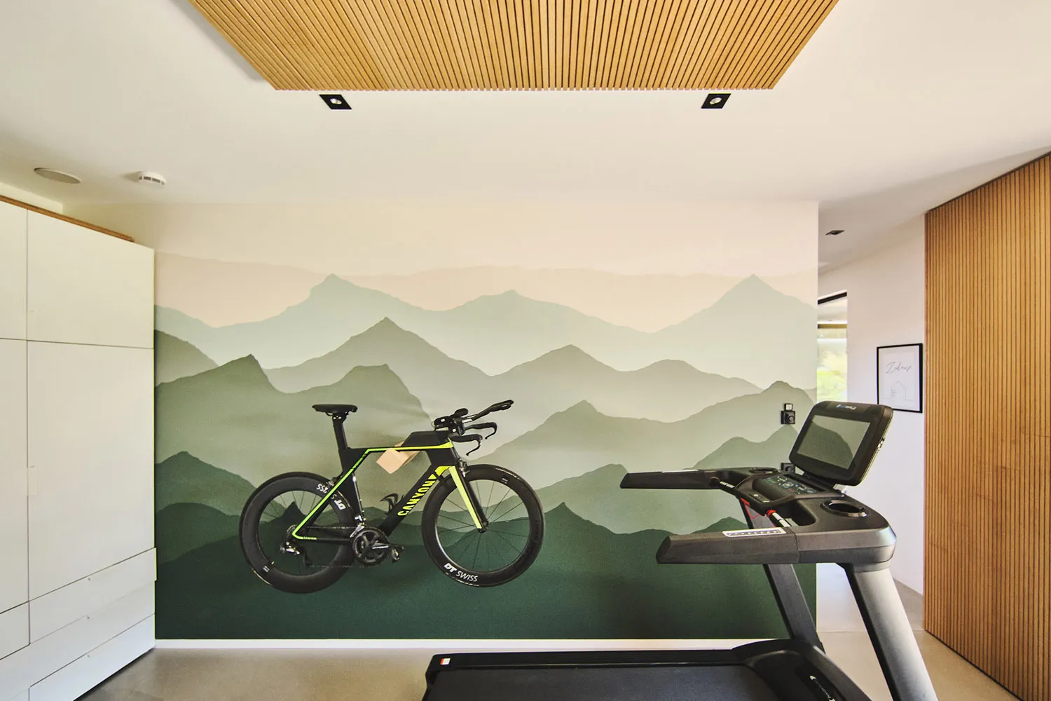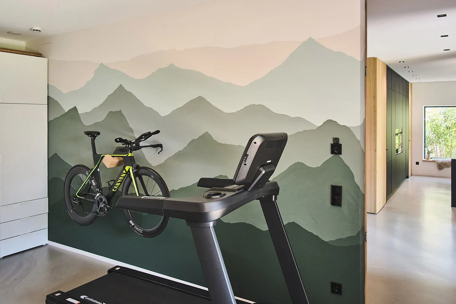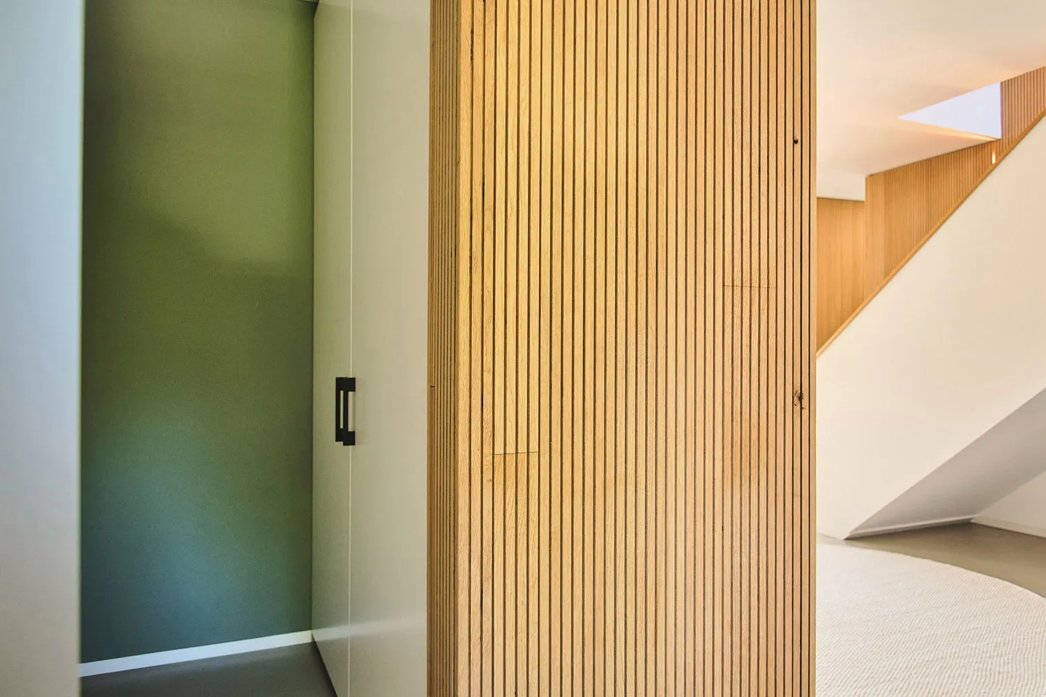 Der Zugang zum Obergeschoss erfolgt über eine Waschbetontreppe mit vollflächiger Holzverkleidung und einer eleganten Schattenfuge. Zur Beleuchtung und Sicherheit sind dezente LED-Stripes in die Treppe eingelassen. Im Kinderzimmer, das neben dem robusten Fischgrätparkett eine schwebende Decke aufweist, setzt sich das warme Erscheinungsbild des natürlichen Baustoffes Holz fort. Die Decke ist über einen individuell gefrästen Treppenaufgang erreichbar. Zusätzlich verfügt das Kinderzimmer über einen integrierten Kletterplatz mit zahlreichen Spielmöglichkeiten.
