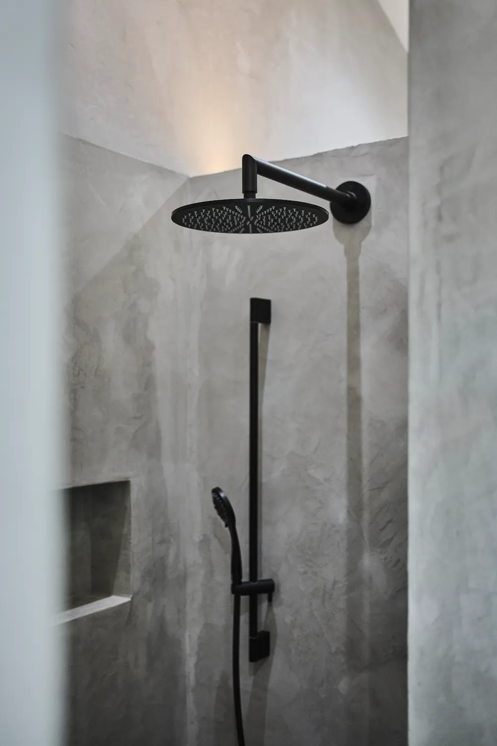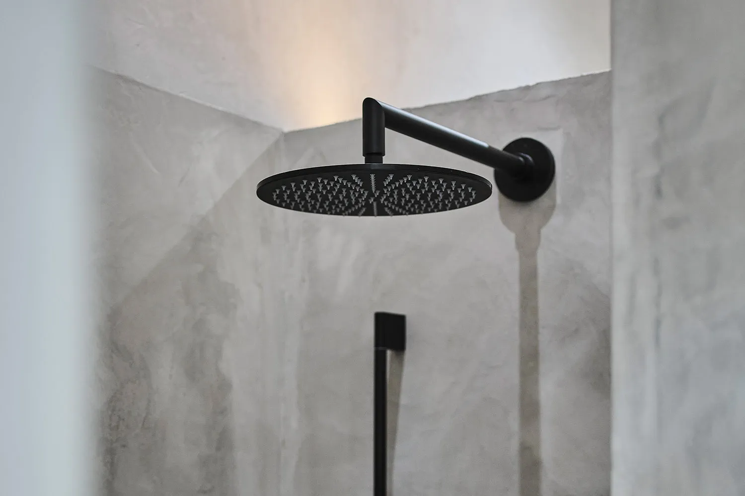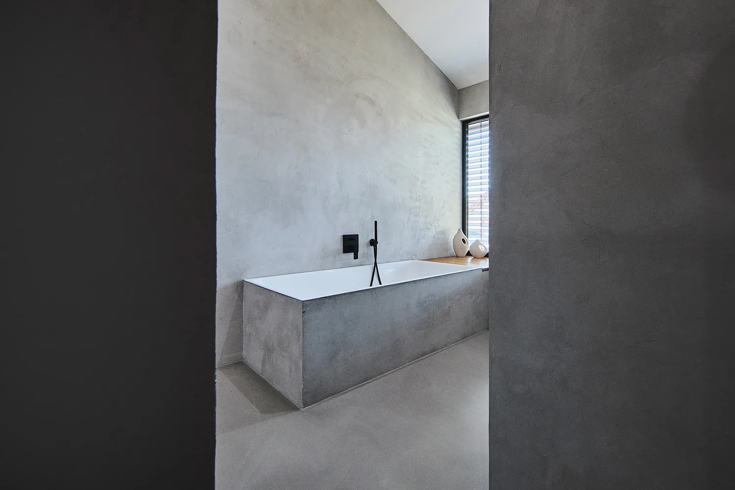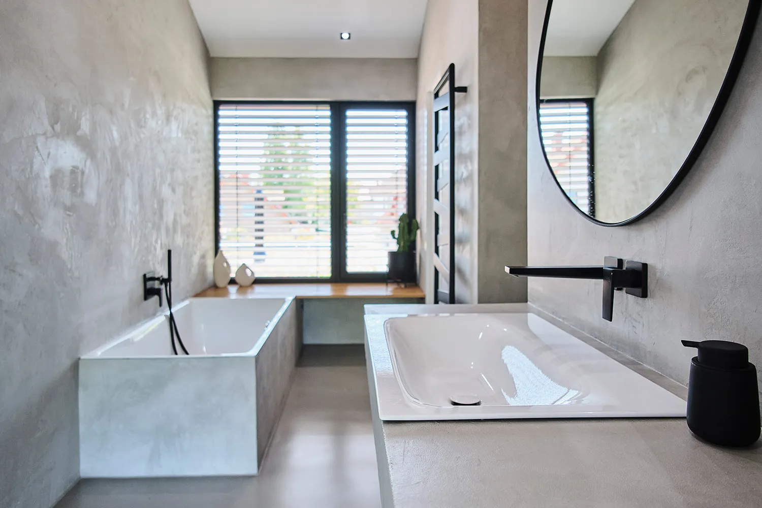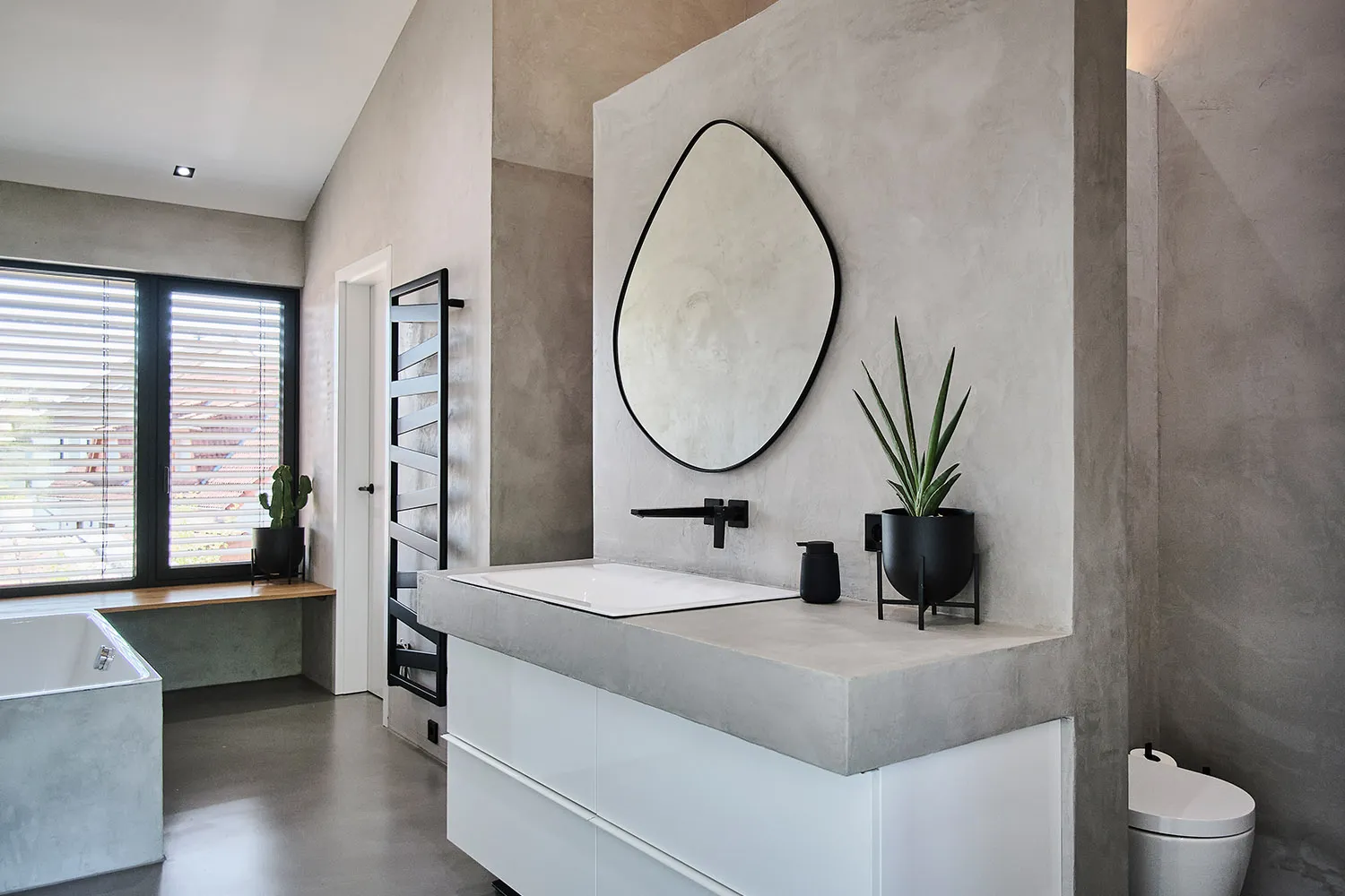 Für den Badbereich wurde eine T-Lösung entwickelt, die separate Bereiche für Badewanne, Dusche und Toilette bietet. Die wasserabweisende und dekorative, fugenlose Mikrozement-Beschichtung umhüllt auch die Badewanne. Die durchdachte Gestaltung ist offen und großzügig angelegt. Es wurden hochwertige Materialien verwendet, begleitet von stilvollen Armaturen. Die Raumaufteilung wurde so konzipiert, dass sowohl Komfort als auch Design höchste Anforderungen erfüllen.