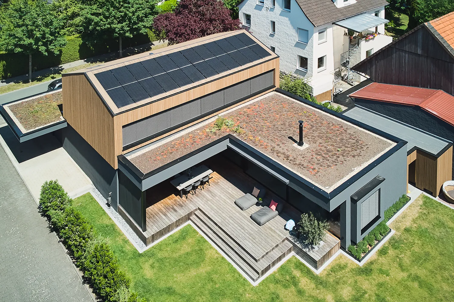 • Dachbegrünung und flächenbündig integrierte Photovoltaikanlage