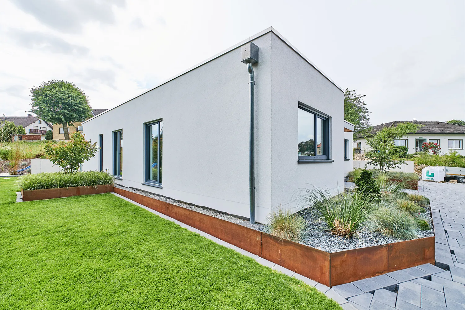 Dieser Bungalow im Bauhaus-Stil vereint geschickt die Vorzüge des Holzrahmenbaus, wodurch er eine natürliche Wärme und zeitlose Modernität erhält. Wir haben unterschiedliche Baumaterialien verwendet und diese dank unserer Expertise im Holzrahmenbau zu einem sinnvollen und ästhetischen Zusammenspiel zusammengefügt. So ist eine angenehme Architektur entstanden, die gleichzeitig Flexibilität in der Gestaltung ermöglicht hat.