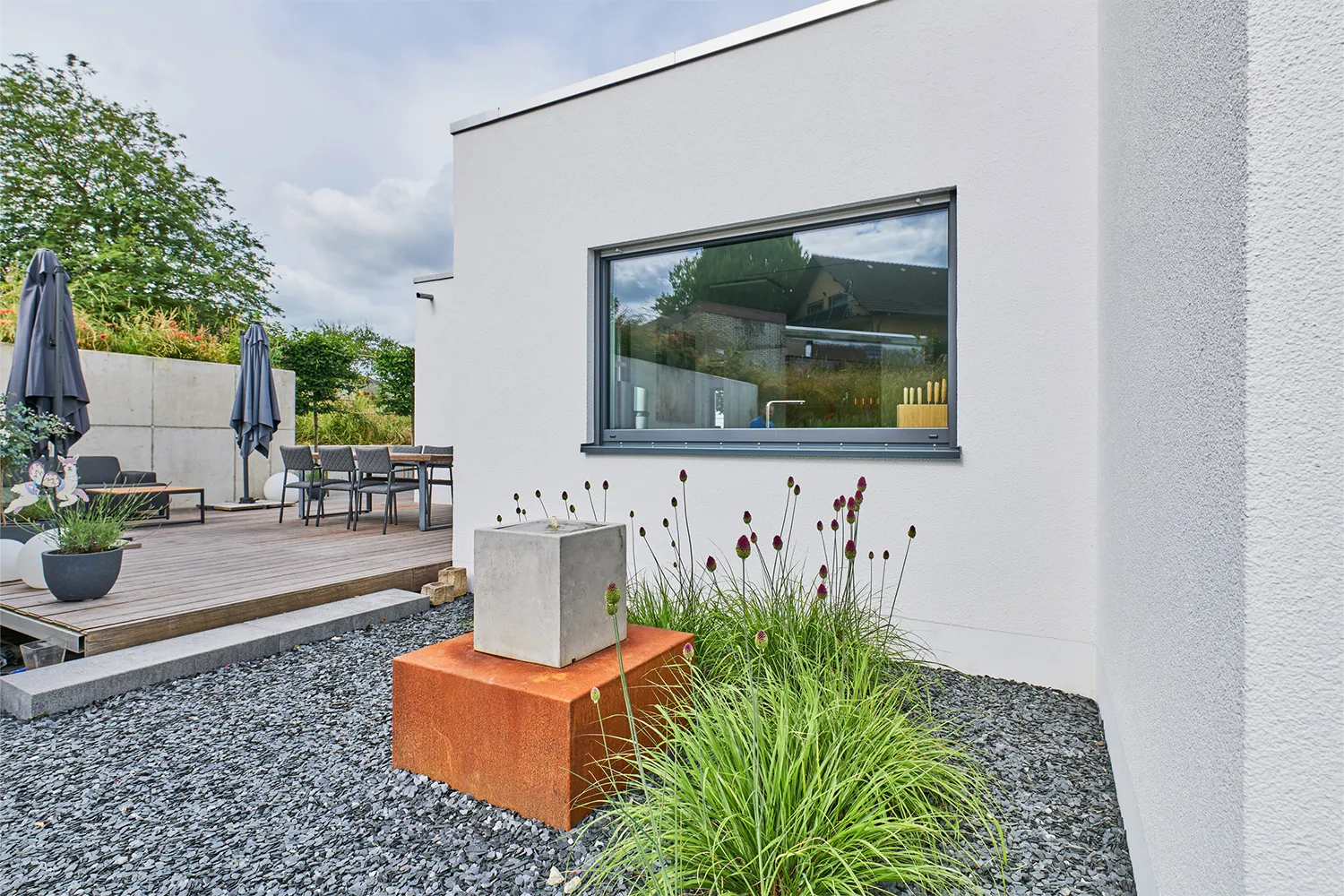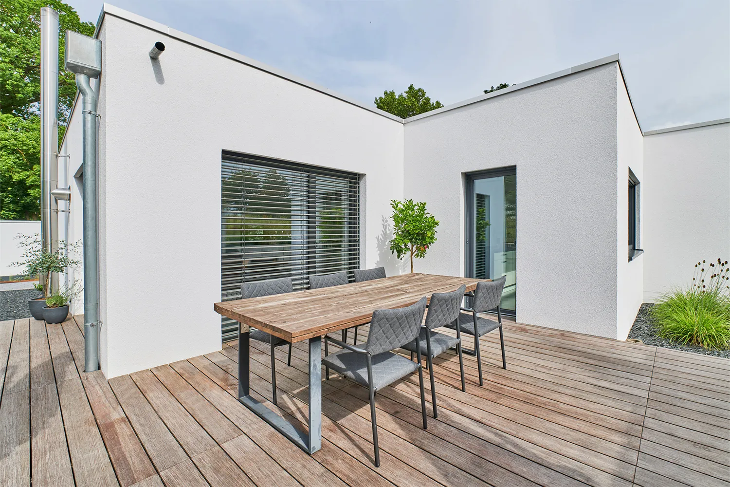 Auf der Rückseite lädt das Holzpodest dazu ein, die Natur zu genießen und sich zu entspannen. Das Design verbindet Innen- und Außenbereich zu einer harmonischen Einheit.