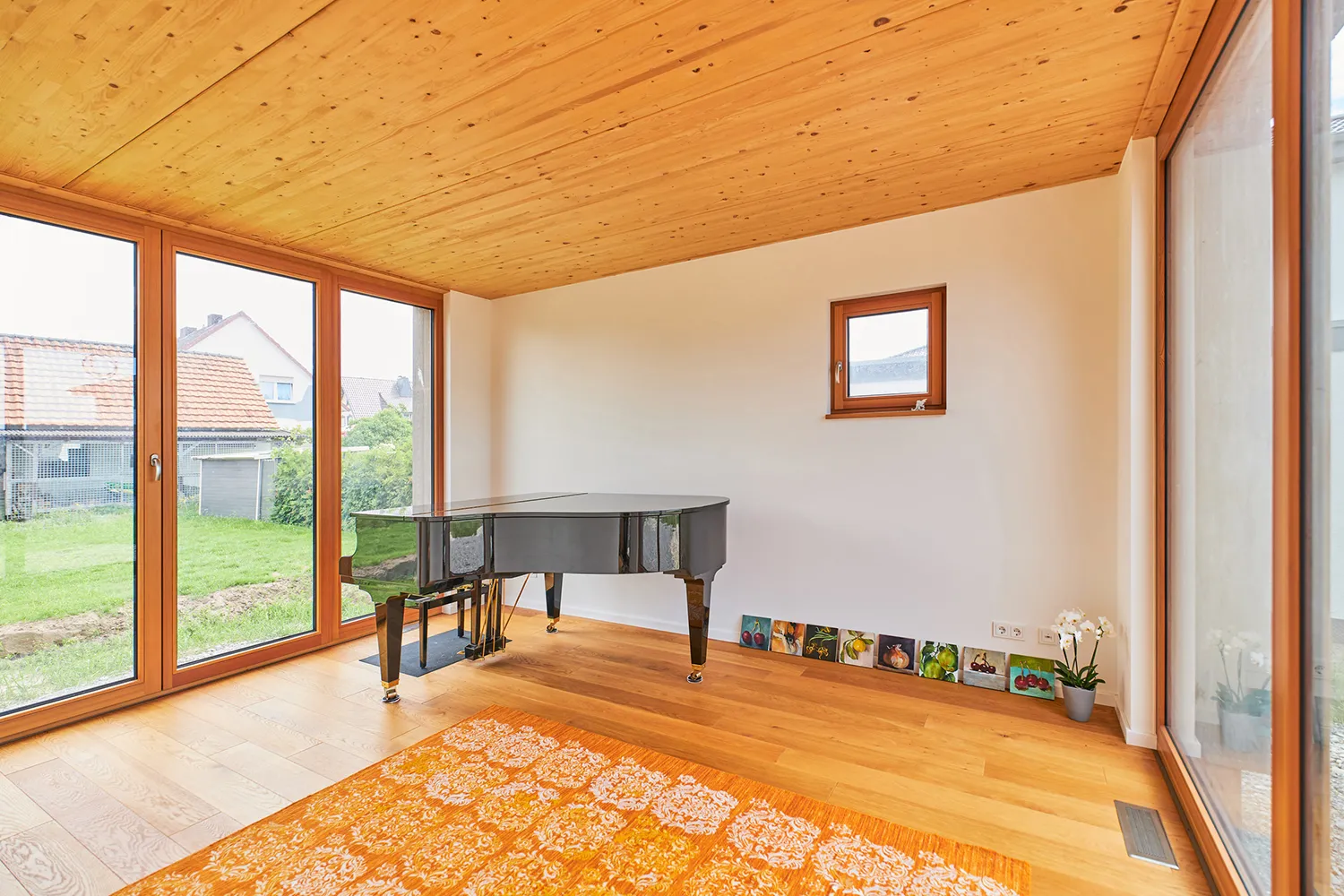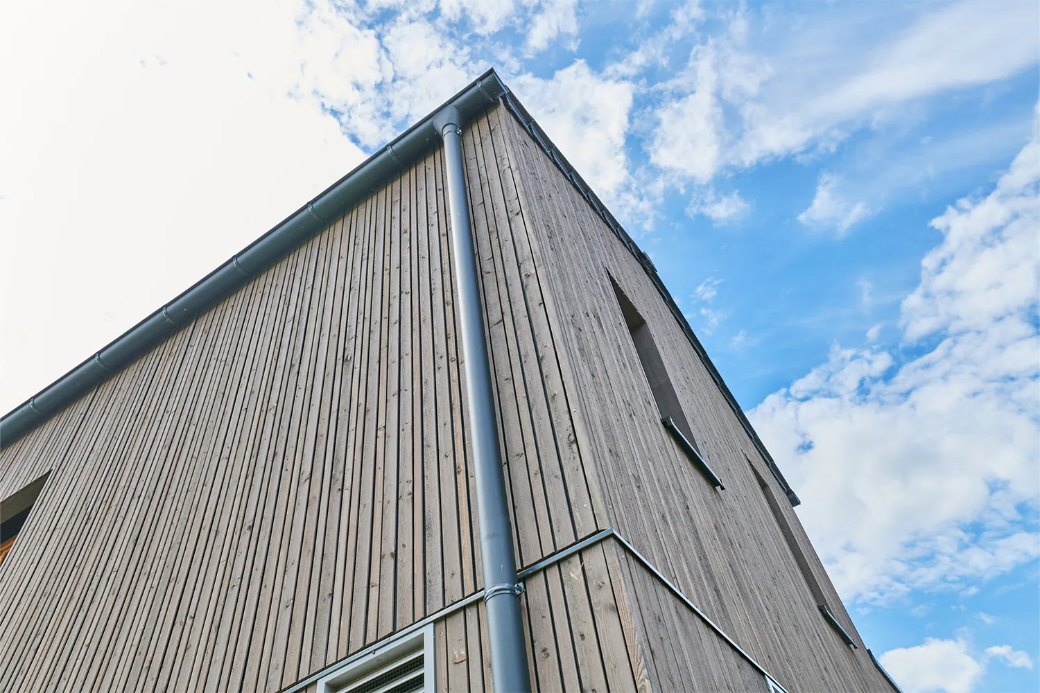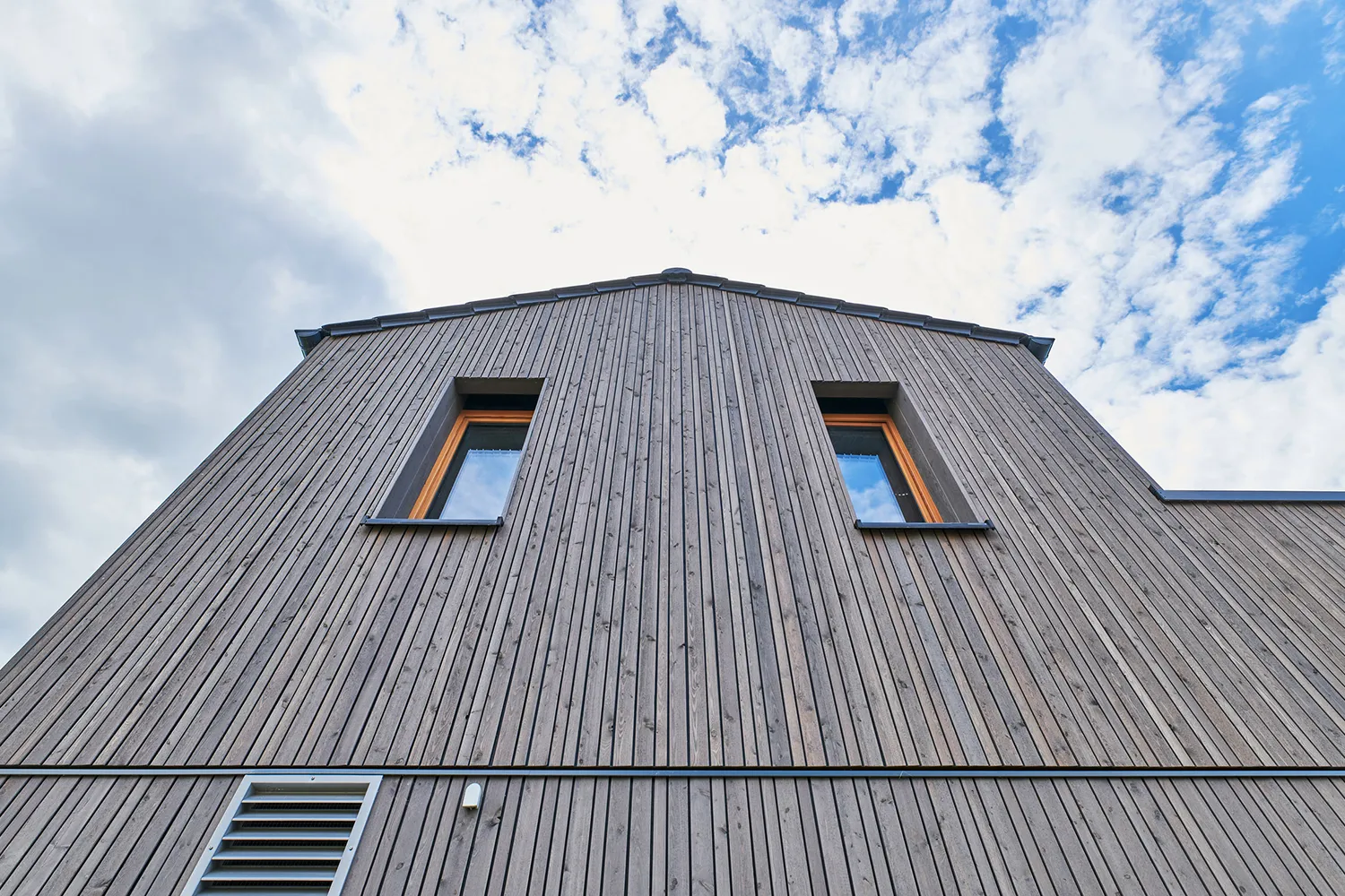 Holz, als faszinierender Baustoff, entfaltet eine bemerkenswerte Wirkung auf alle Sinne. Eine Fassade, die vollständig aus Holz besteht, verleiht einem Gebäude eine angenehme Atmosphäre mit einem warmen Charakter. Durch einen Dielenboden und eine Holzdecke wird dieser Effekt geschmackvoll verstärkt und ein angenehmes Raumklima geschaffen. Großzügige Fenster sorgen für viel Tageslicht. Die offenen Balken im Giebel verleihen dem Innenraum einen einladenden Charakter und tragen zu einem charmanten Gesamtbild bei.