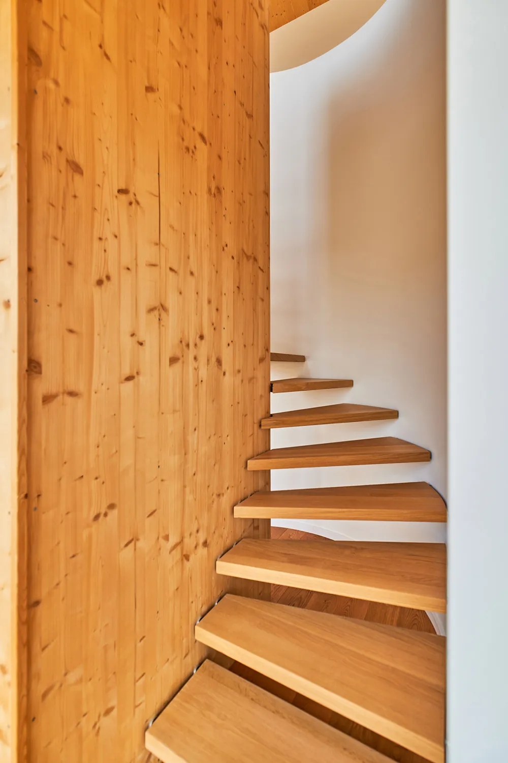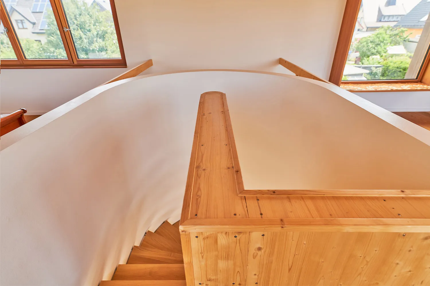 Dank eines eleganten, runden Treppenaufgangs aus Holz, der sich in einem lichtdurchfluteten Atrium erstreckt, wird das gesamte Haus von natürlichem Licht durchflutet. In der ersten Etage ermöglichen bodentiefe Fenster mit Glasgeländern einen beeindruckenden Ausblick. Eine großzügige Sitzfensterbank lädt zum Verweilen und Genießen der Aussicht ein.
