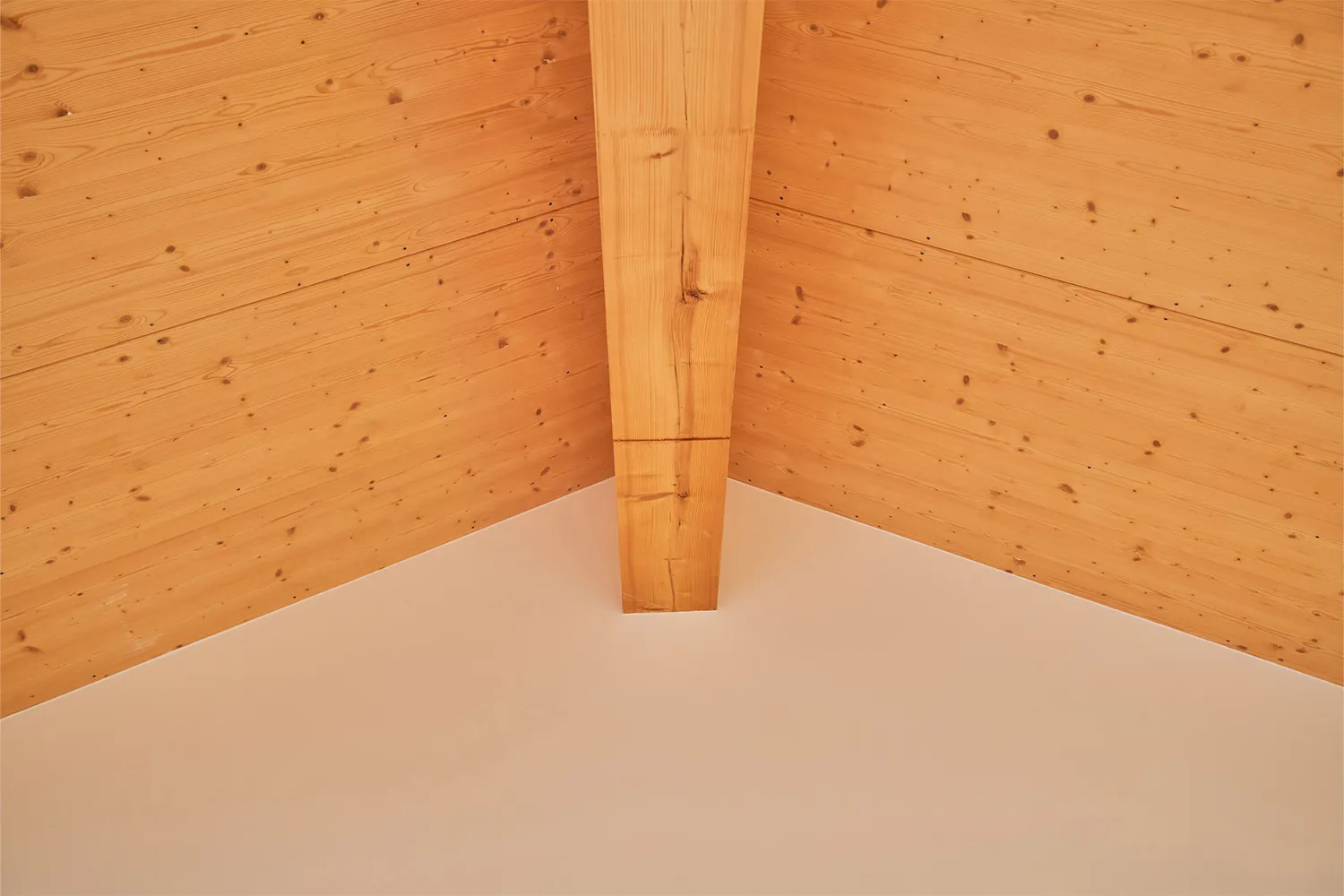 • Holzdielenboden, Holzdecke und offene Balken im Giebel