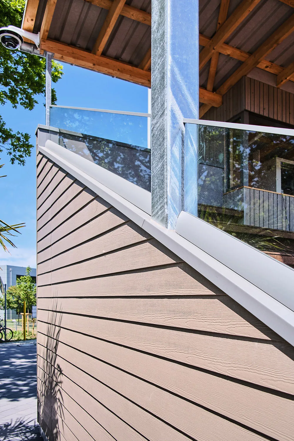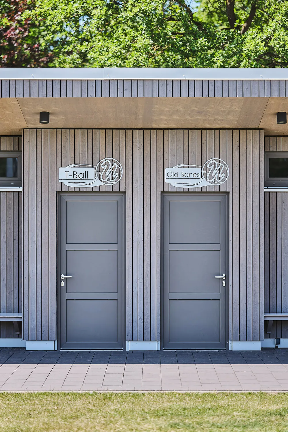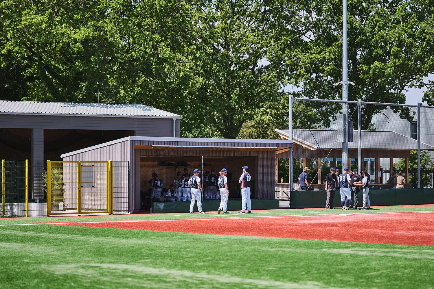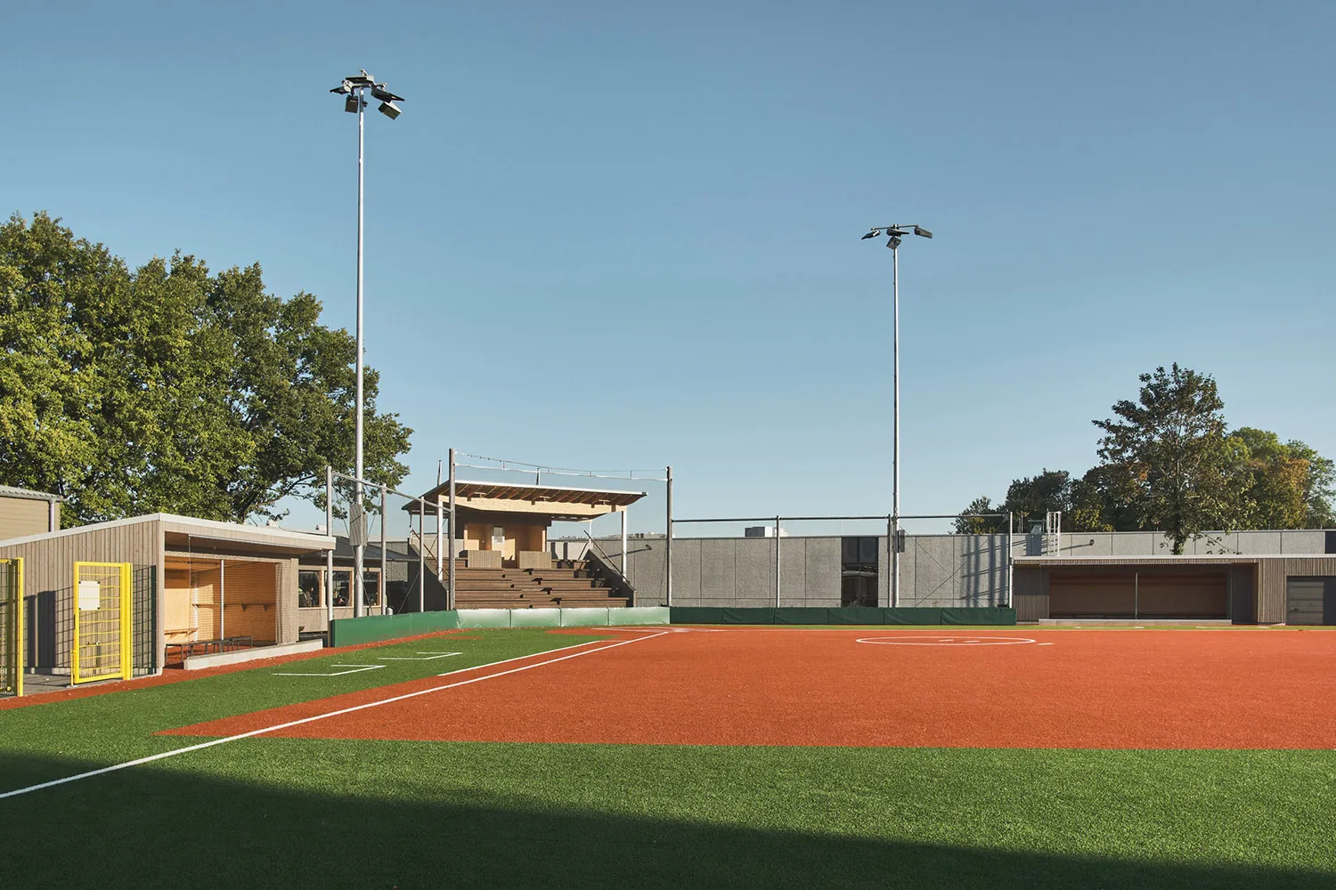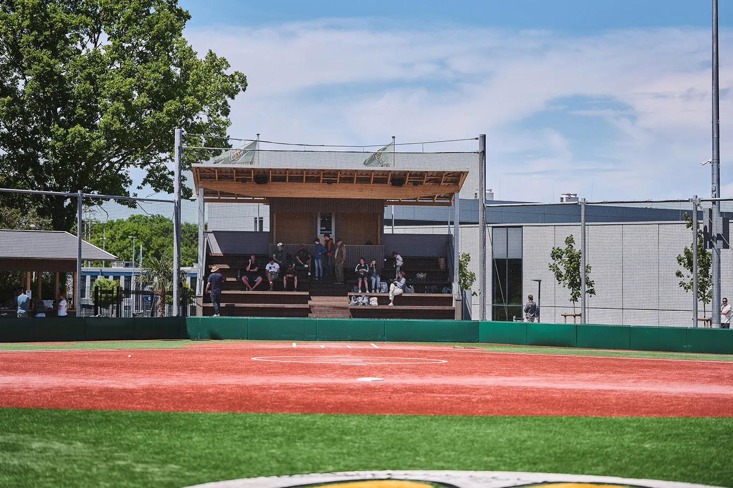Der Baseballplatz verfügt über eine überdachte Tribüne aus Holz, die als zentraler Treffpunkt dient. Von hier aus können Fans und Eltern die Spiele des Nachwuchses regen- und windgeschützt sowie mit bester Sicht verfolgen. Die Tribüne hat eine offene Balkenstruktur. Die Sitz- und Treppenkonstruktion sorgt für Komfort und fügt sich in die natürliche Umgebung ein.