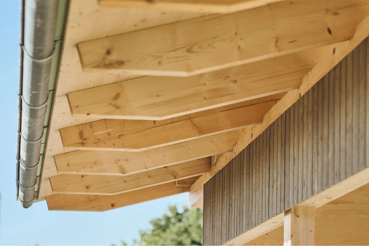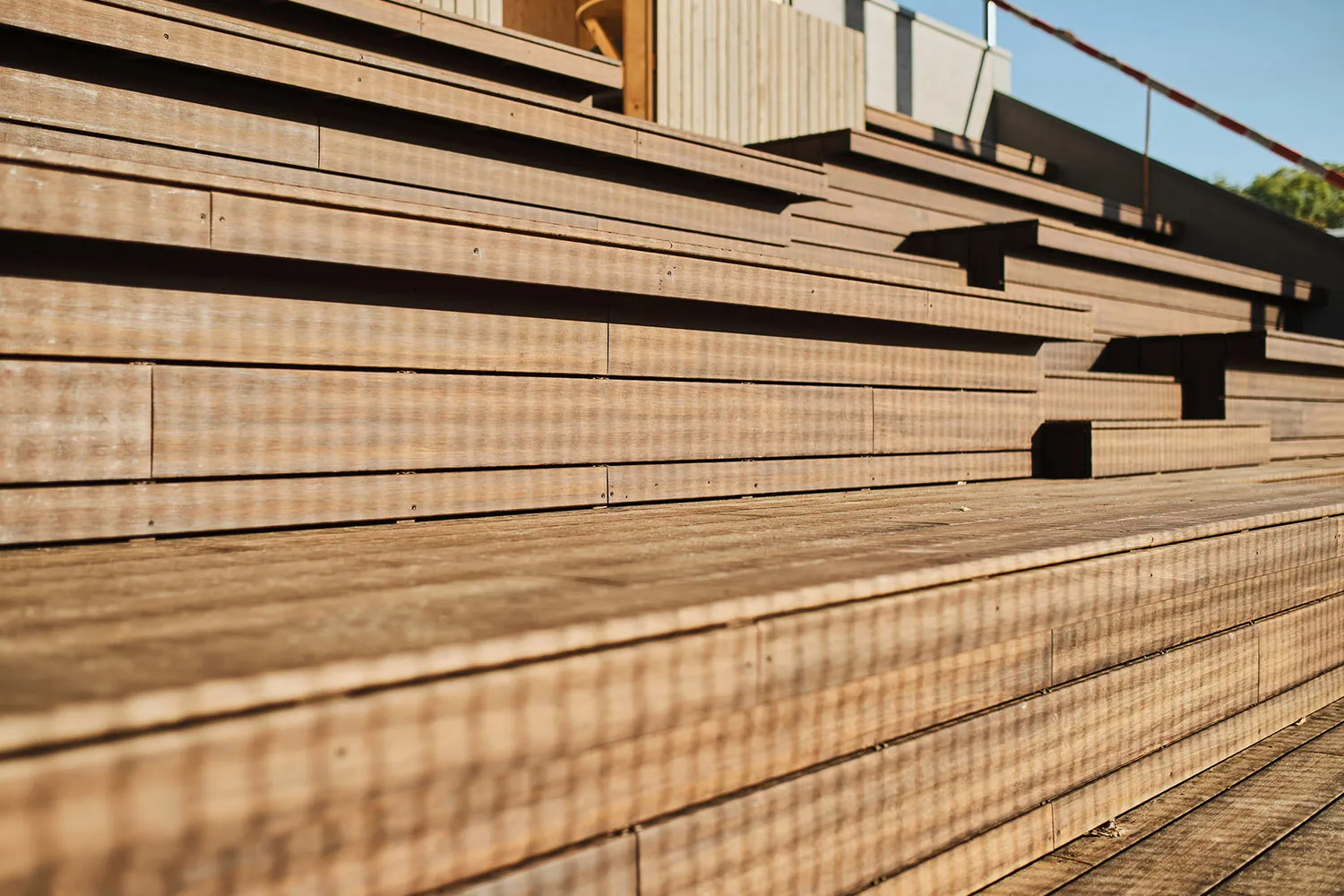 • Überdachte Tribüne aus Holz mit offener Balkenlage