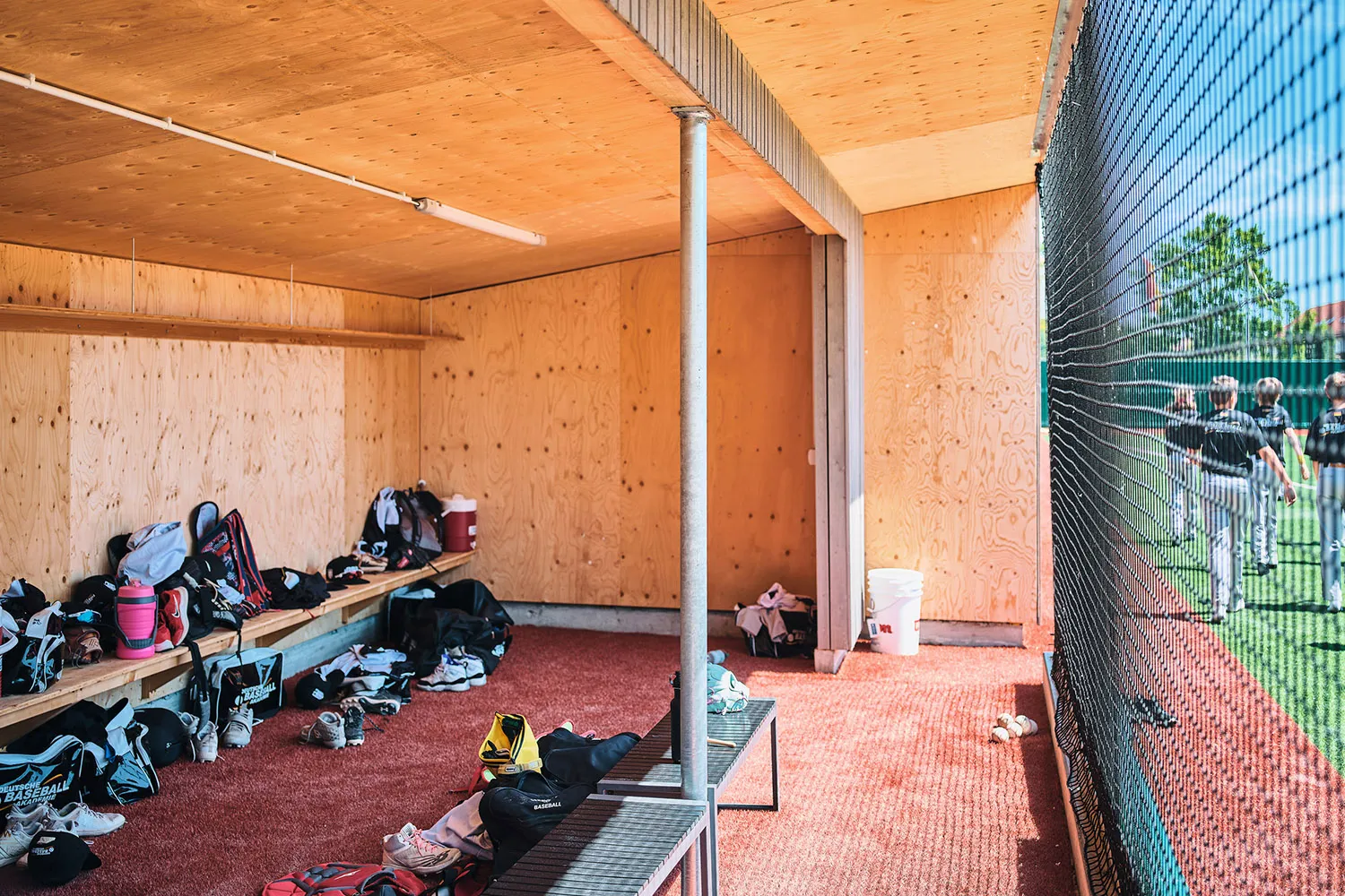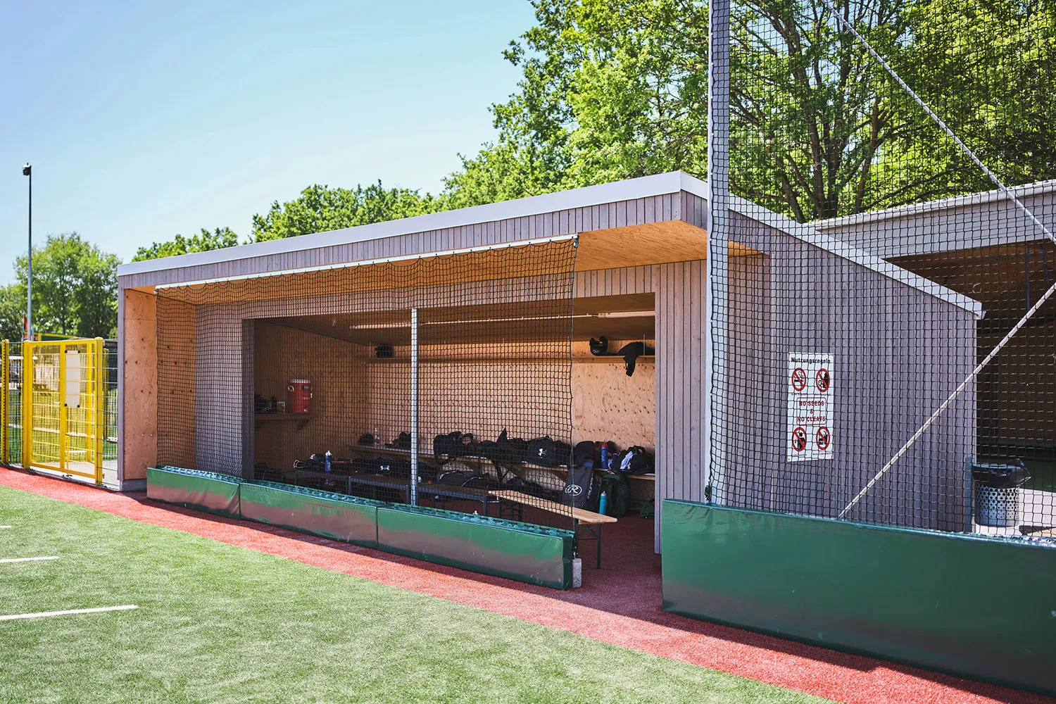 Die Dugouts aus Holz dienen als Rückzugsorte für die Mannschaft. Dort kann sie sich auf ihre Einsätze vorbereiten und ist vor den Witterungseinflüssen geschützt.