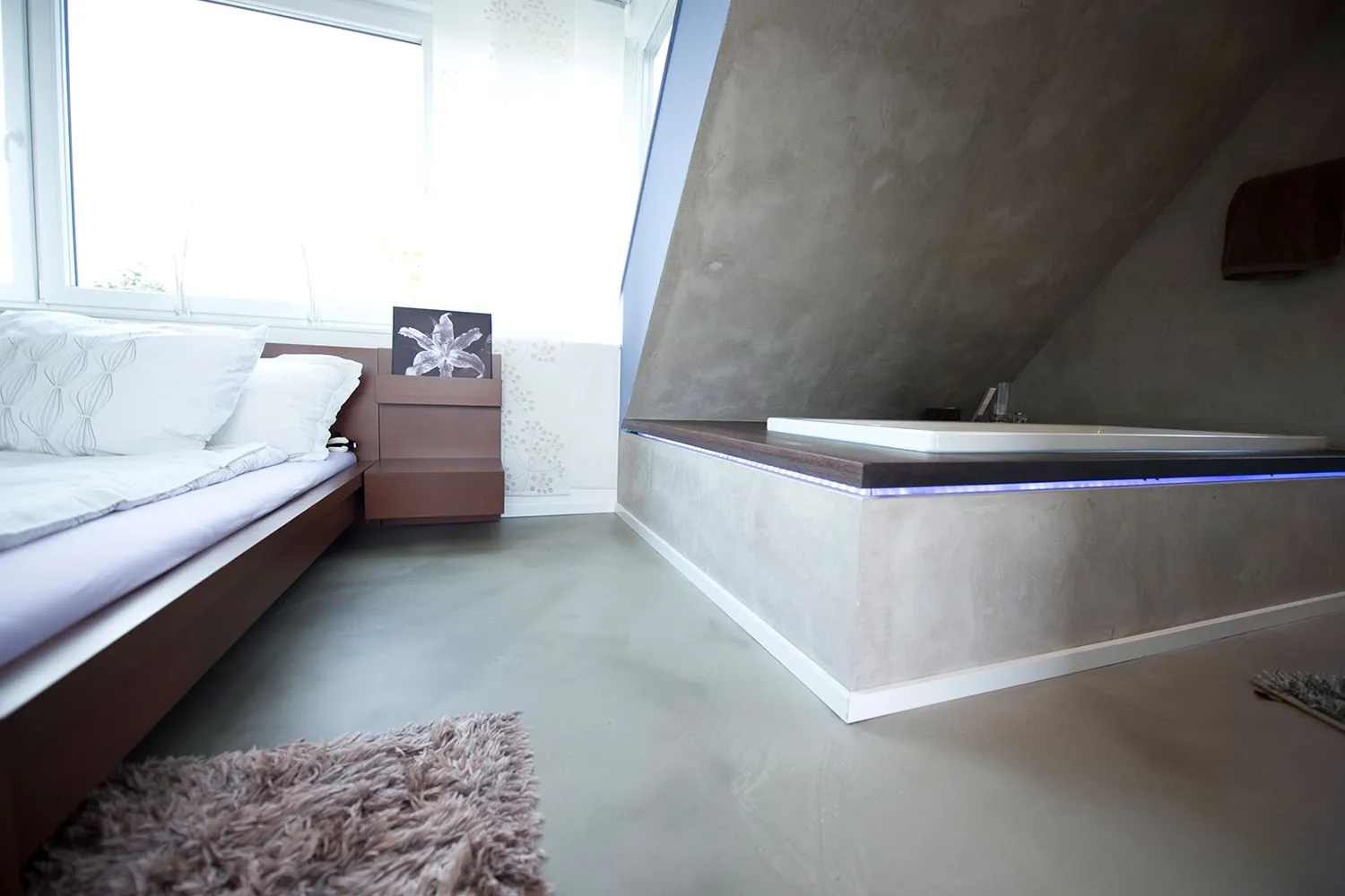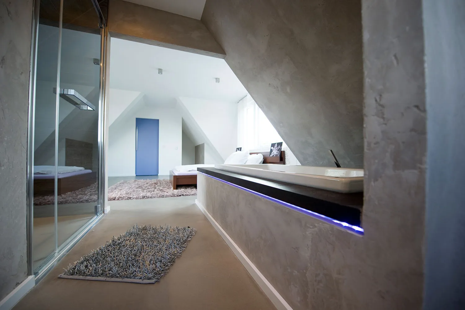 Die Aufstockung fand im Rahmen der Gesamtsanierung des Haues statt. Die Gaube besticht nicht nur durch ihre extravagante Form, sondern auch durch die Trespaverkleidung in Metallicausführung sowie die Ganzglasbrüstung. Im Inneren wurde durch die Dachgaube der Wohnraum erweitert, der nun offen über zwei Etagen führt. Eine stilvolle Kragarmtreppe führt von der unteren in die obere Etage.