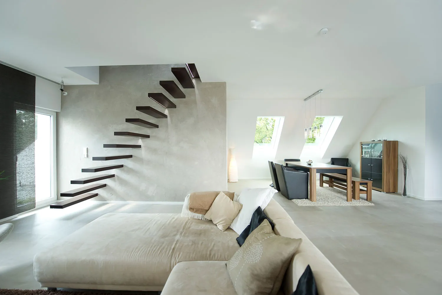• im Inneren: offener Wohnraum über zwei Etagen, stilvolle Kragarmtreppe