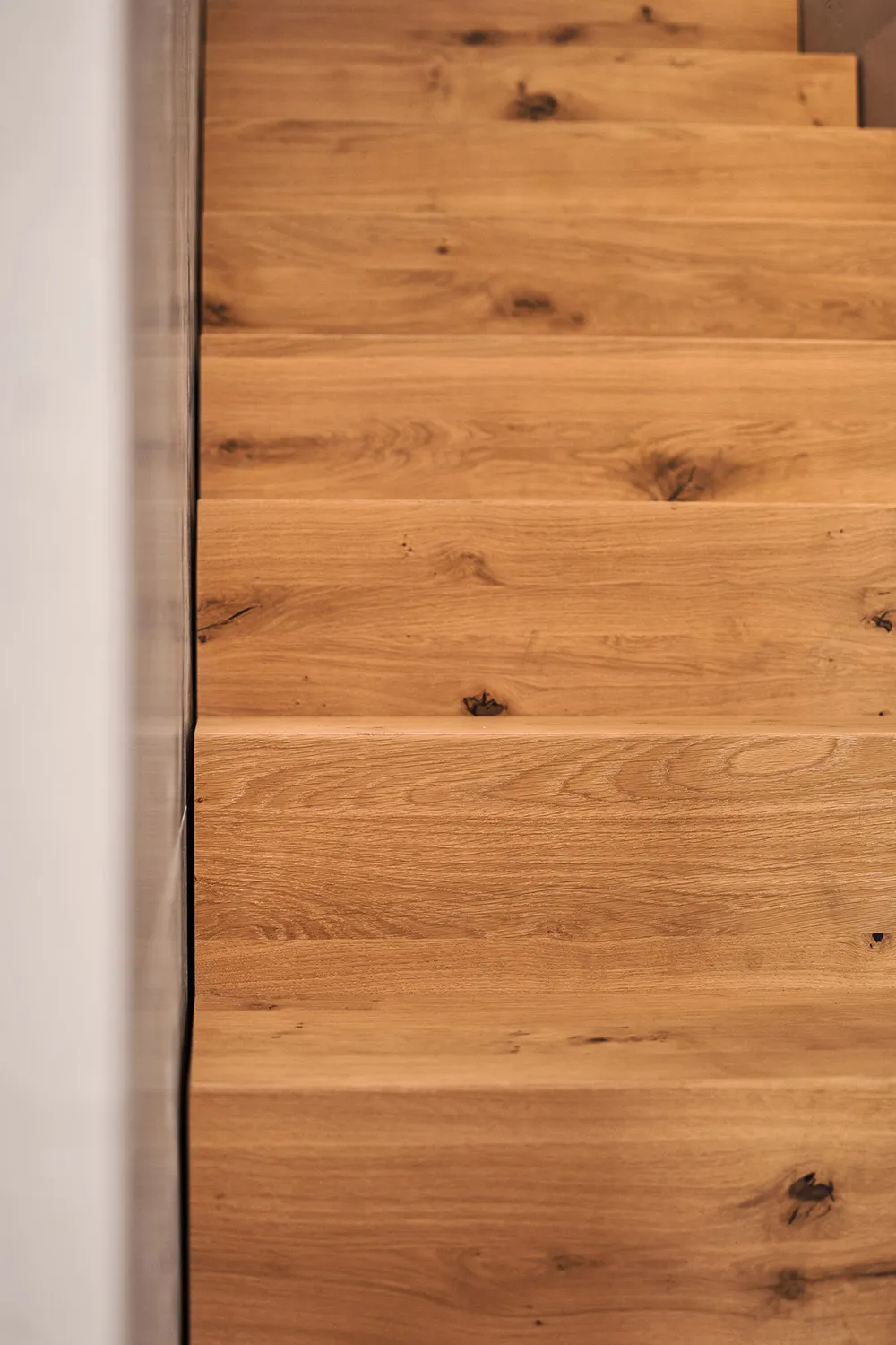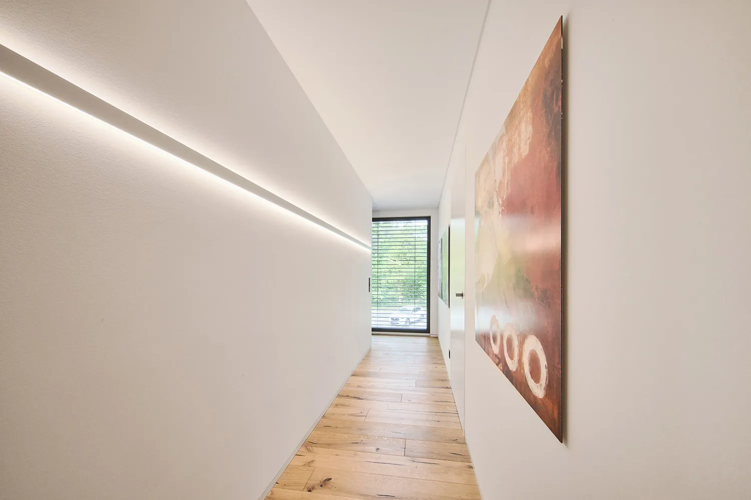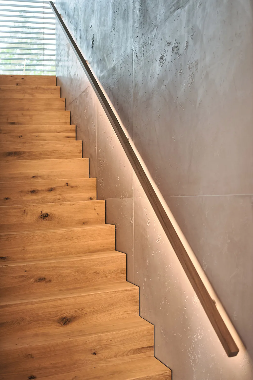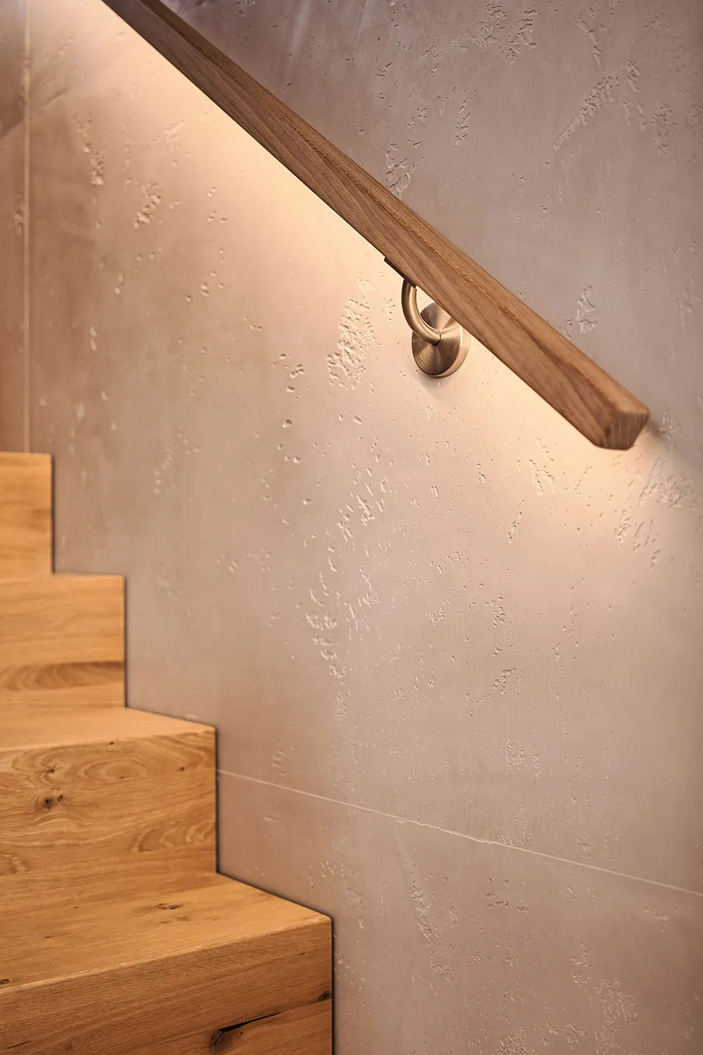 Die Holztreppe zeichnet sich durch ein kunstvoll angelegtes Design mit Schattenfuge aus. Der Handlauf ist mit indirektem Licht versehen. Die Türen sind bündig eingelassen und ohne Rosetten gestaltet, während die Fußleisten flächenbündig in der Wand liegen. Diese Elemente tragen zur klaren Linienführung bei und verleihen dem Objekt Charakter und Stil.