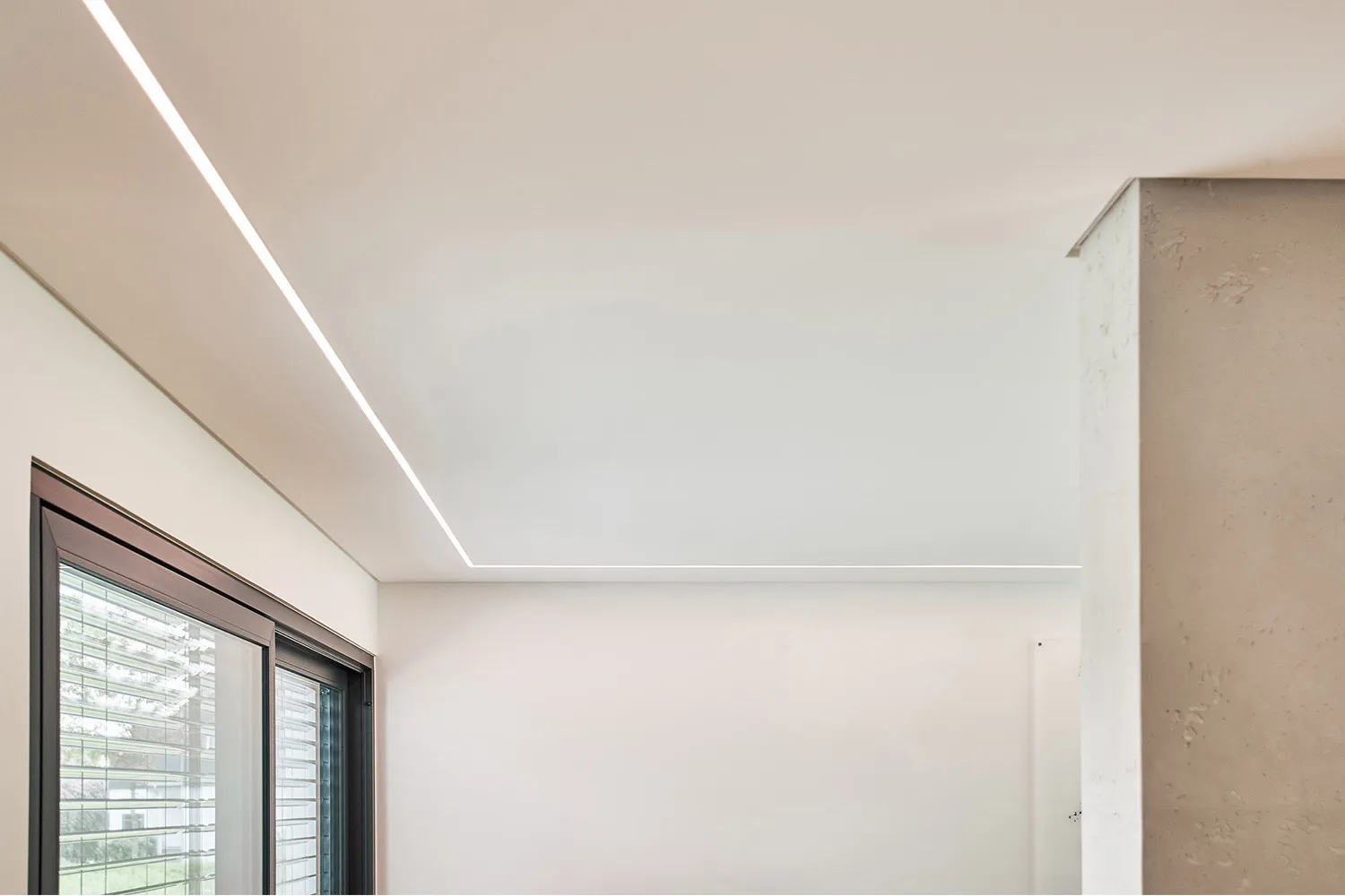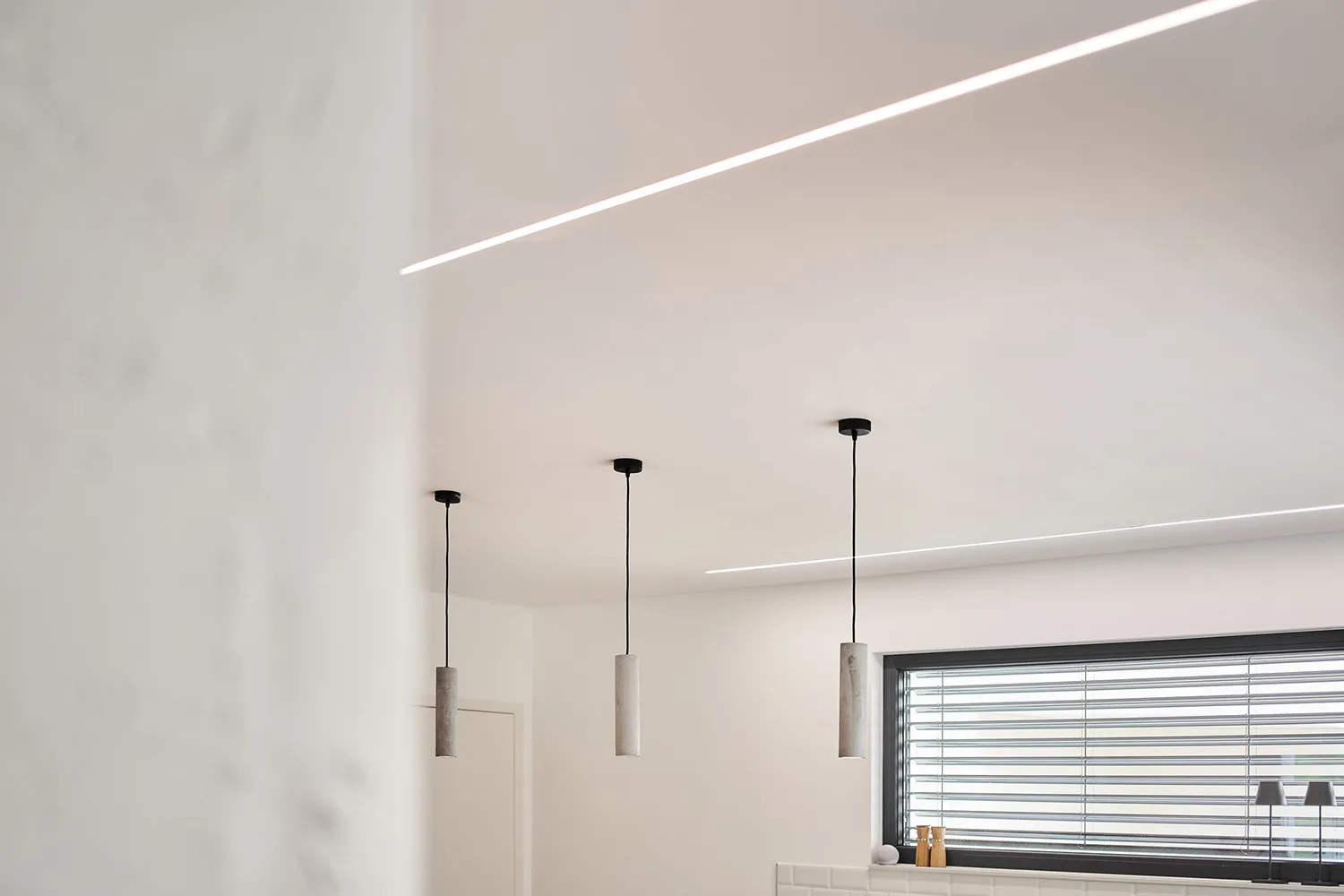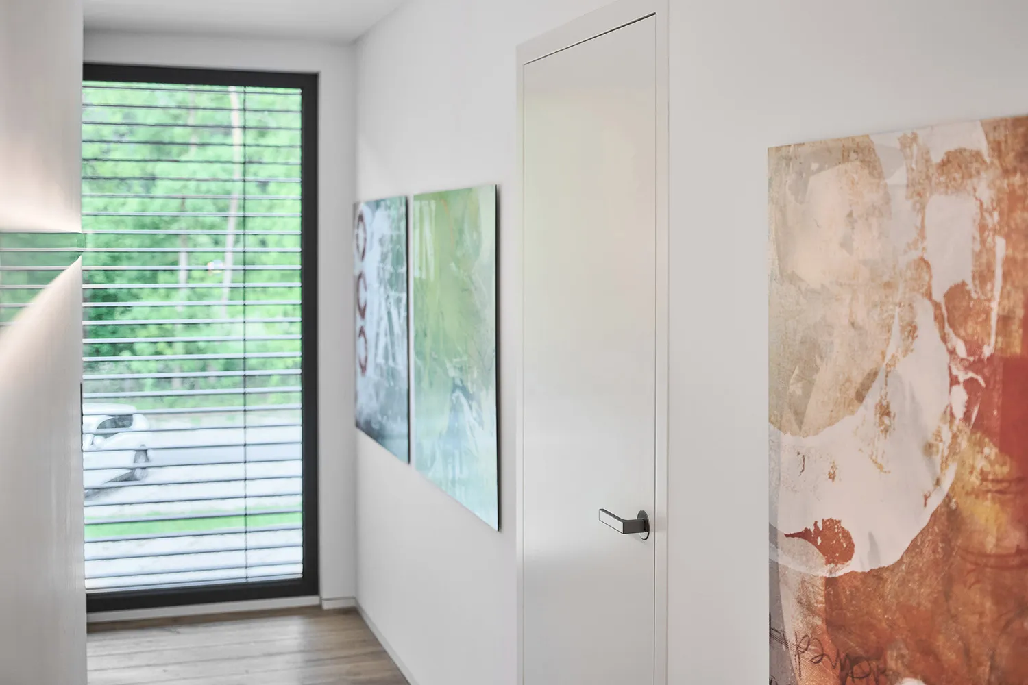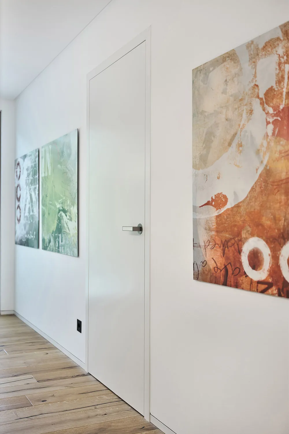Die Holztreppe zeichnet sich durch ein kunstvoll angelegtes Design mit Schattenfuge aus. Der Handlauf ist mit indirektem Licht versehen. Die Türen sind bündig eingelassen und ohne Rosetten gestaltet, während die Fußleisten flächenbündig in der Wand liegen. Diese Elemente tragen zur klaren Linienführung bei und verleihen dem Objekt Charakter und Stil.