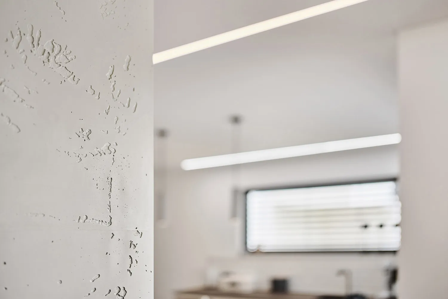 Der Boden besteht aus Natureiche und verleiht den Räumen eine warme Natürlichkeit und hervorragende Akustik. Die Wände aus Sichtbeton schaffen einen zeitgemäßen Kontrast. Darüber hinaus sorgt ein Lichtband in der Decke für eine akzentuierte Beleuchtung.