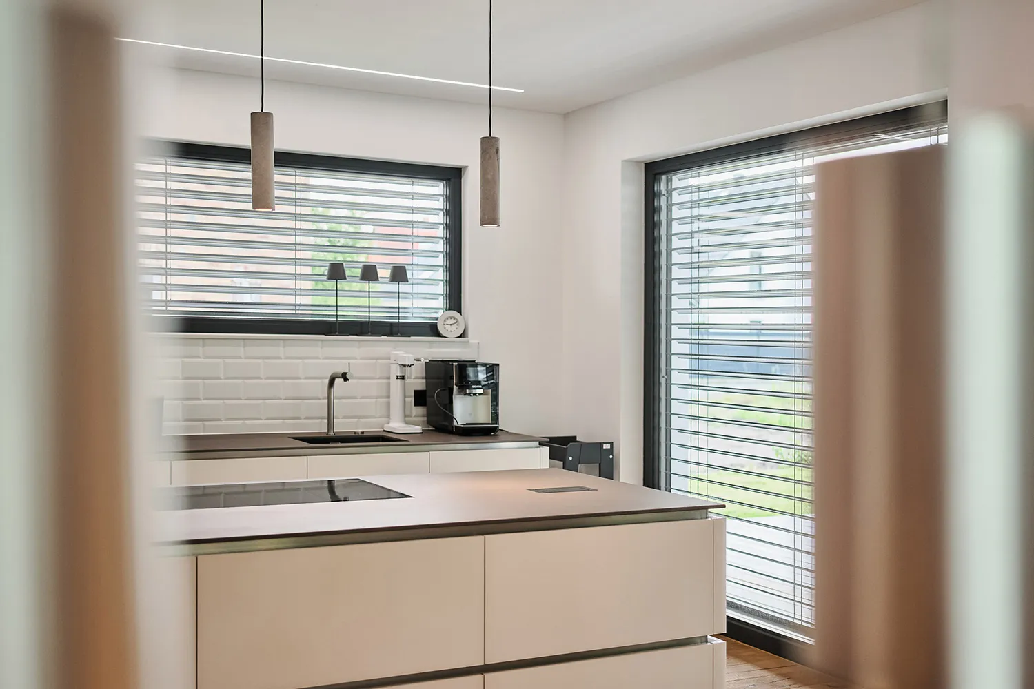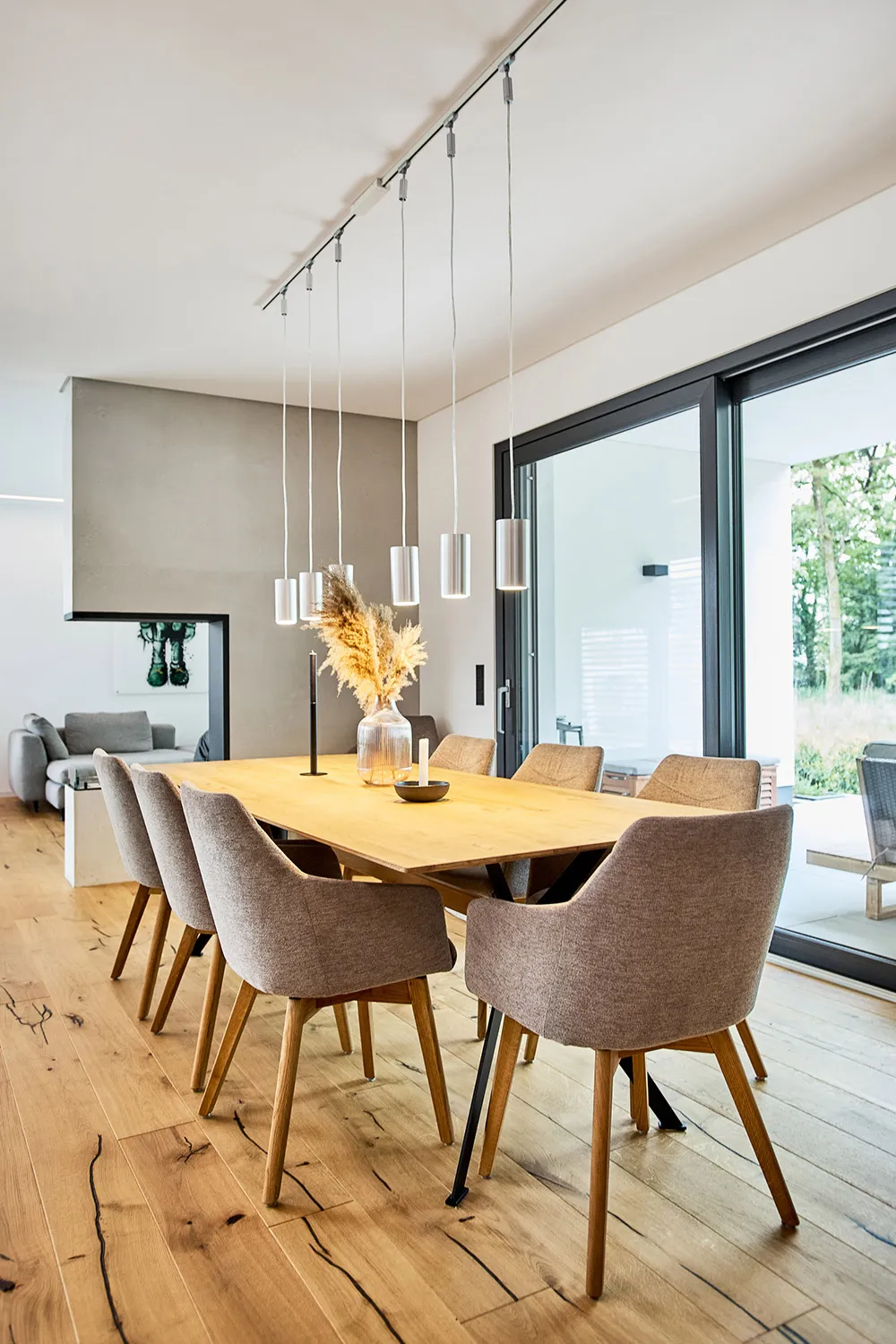 Dieser Neubau zeigt, wie flexibel sich Holz in verschiedenen architektonischen Stilen einsetzen lässt. Als erfahrenes Generalunternehmen haben wir die zeitlose Eleganz des Bauhausstils mit einer großzügigen, offenen Raumgestaltung vereint. Jedes Detail, von der Küche bis zur Treppe, vom Eingang bis zum Outdoor-Bereich, wurde mit höchster Sorgfalt und Präzision geplant und gefertigt.