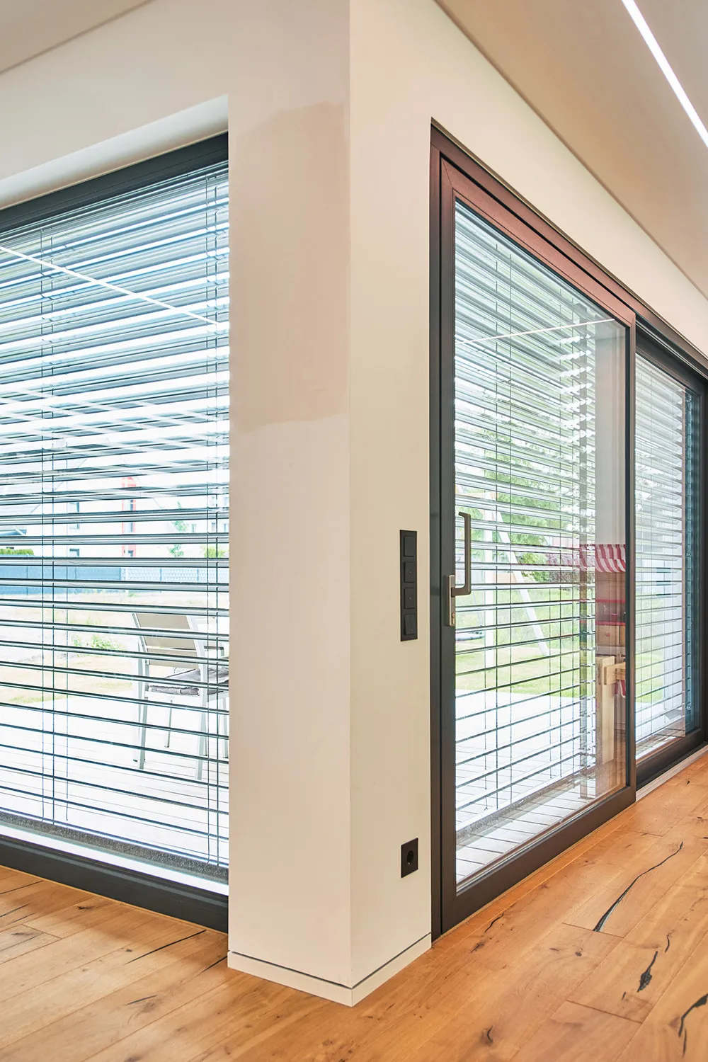 Das Holzportal mit integriertem Fingerprint-Öffner unterstreicht die Exklusivität und Individualität des Hauses. Im Außenbereich laden zwei Terrassen zum Entspannen ein. Die überdachte Loggia gewährt Schutz und ermöglicht somit selbst bei ungünstigem Wetter Outdoor-Aktivitäten. Gleichzeitig bietet die nach Südosten ausgerichtete Terrasse eine ideale Umgebung für angenehme Sommerabende.