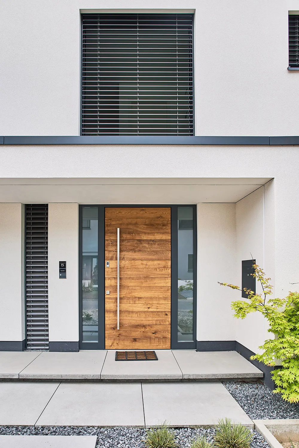 • Markantes Holzportal mit integriertem Fingerprint-Öffner